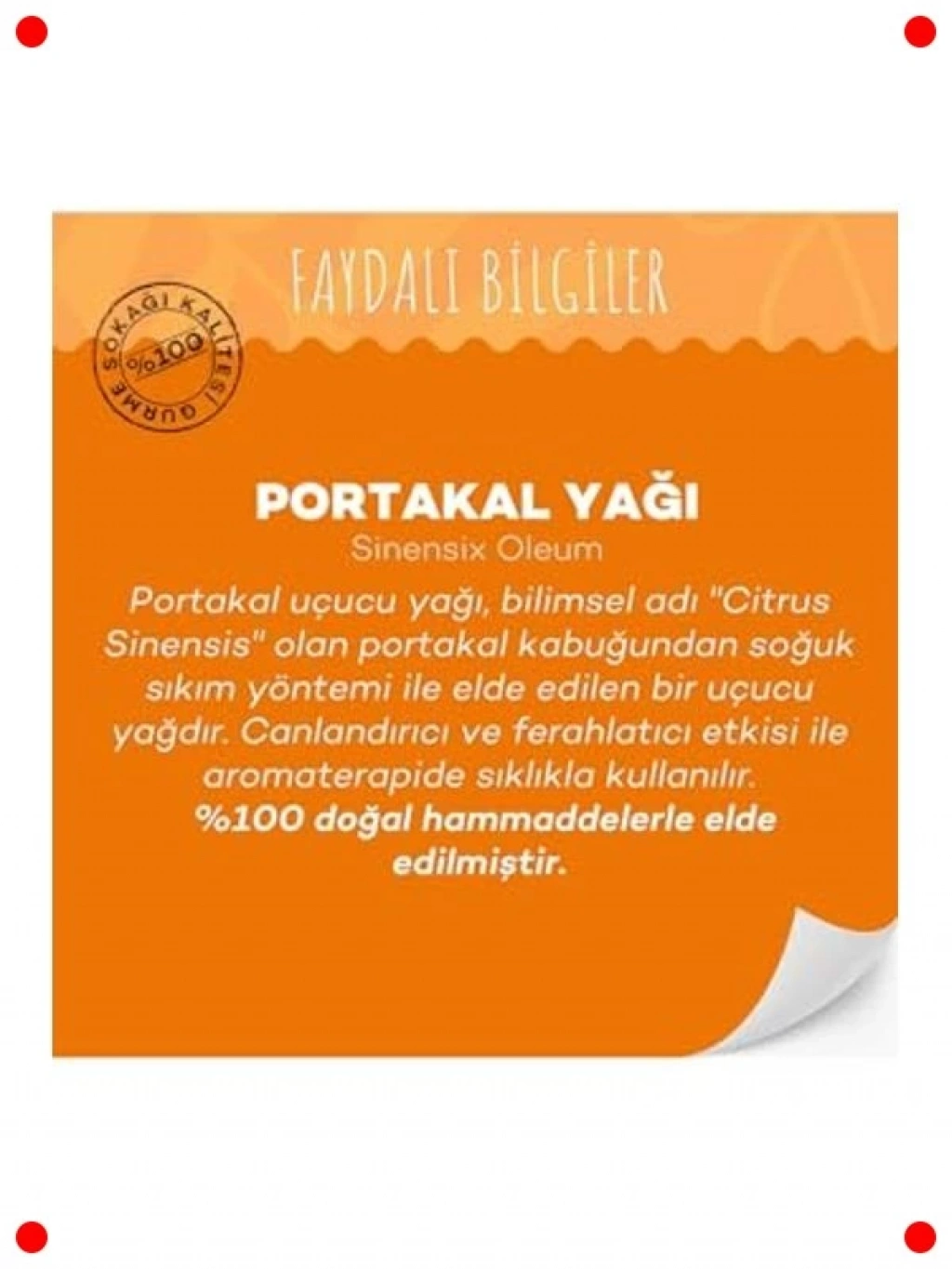 Ferahlatıcı ve canlandırıcı kokusuyla bilinen bu doğal portakal kabuğu yağı, ruh halinizi iyileştirmeye ve enerjinizi yükseltmeye yardımcı olur. Aromaterapi uygulamalarında sıklıkla tercih edilen bu yağ, ortamın havasını tazeleyebilir ve stresi azaltabilir. Cilt bakımında, antioksidan özellikleri sayesinde cildin daha canlı görünmesine katkıda bulunabilir. Saç bakımında ise saç derisini besleyerek sağlıklı uzamayı destekleyebilir. Difüzörlerde, masaj yağlarında veya birkaç damla suya ekleyerek kullanılabilir. %100 saf ve doğal içeriği ile günlük rutininize pozitif bir dokunuş katın.