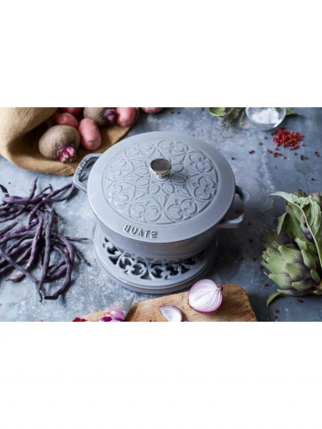 Fransa menşeli bu döküm nihale, hem pratik hem de dekoratif bir tasarıma sahiptir. İndüksiyon ocakları ve fırınlarda kullanılabilen bu nihale, yüksek kaliteli malzemeden üretilmiştir. Zamansız tasarımı, mutfak dekorasyonunuza şıklık katacak.