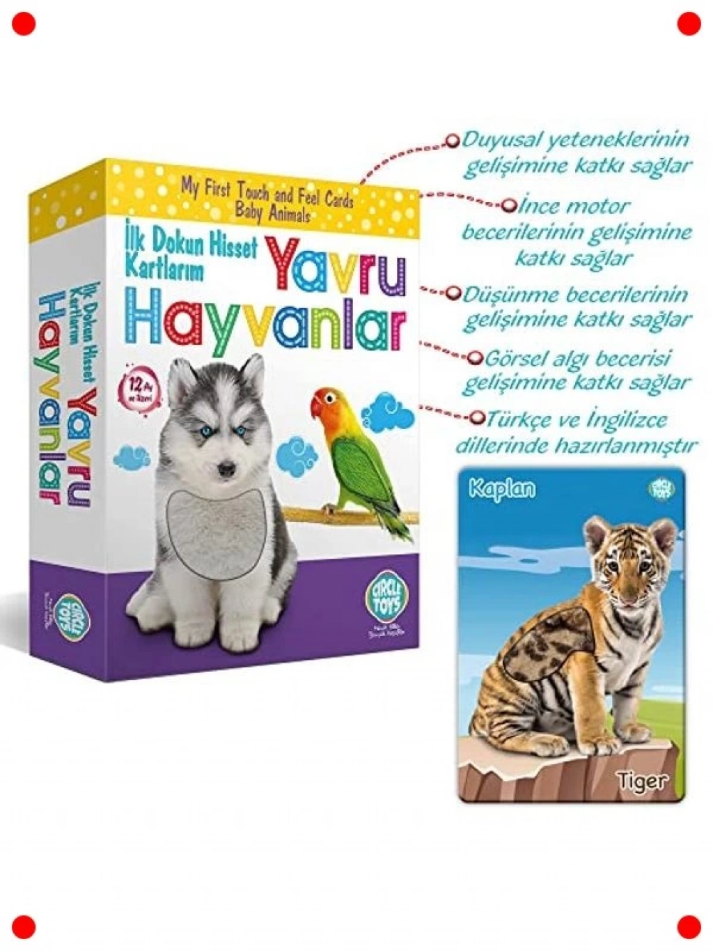 Yavru hayvanların sevimli dünyasını minik parmaklarla keşfetmeye hazır olun! Bu dokun-hisset özellikli kumaş kitap, bebeklerin duyusal gelişimini desteklerken aynı zamanda farklı dokuları ve hayvanları tanımasını sağlar. Her sayfada yumuşacık, pürüzlü veya tüylü farklı malzemelerle karşılaşacaklar. Canlı renkler ve eğlenceli çizimler, bebeklerin görsel algısını güçlendirir ve hayvan sevgisini aşılar. Güvenli ve yıkanabilir malzemelerden üretilmiş olup, kolayca taşınabilir yapısıyla hem evde hem de dışarıda harika bir öğrenme arkadaşıdır. Küçük kaşifler için ideal, eğlenceli ve eğitici bir deneyim sunar.
