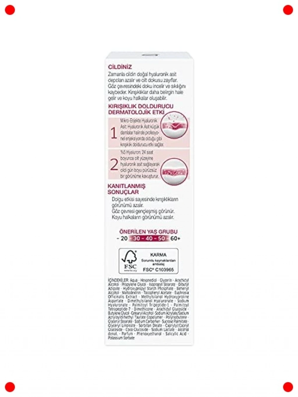 Göz çevresindeki yaşlanma belirtileriyle savaşmak için özel olarak geliştirilmiş bu dolgunlaştırıcı göz kremi, cildinize gençlik ve canlılık kazandırır. İçeriğindeki özel aktif bileşenler sayesinde ince çizgi ve kırışıklıkların görünümünü doldurmaya yardımcı olurken, göz çevresini sıkılaştırır ve lifting etkisi sunar. Yoğun nemlendirme özelliğiyle göz altındaki kuruluğu giderir, cildin daha pürüzsüz ve esnek olmasını destekler. Düzenli kullanımla göz çevresinin daha aydınlık, dinlenmiş ve genç bir görünüme kavuşmasına yardımcı olur. Hafif ve kolay emilen yapısı, hassas göz çevresi için idealdir.