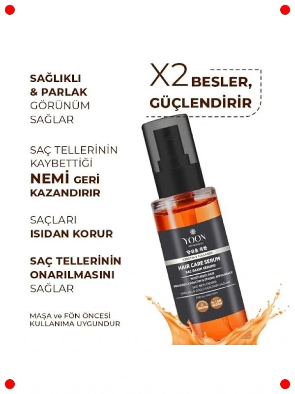 Bu durulanmayan saç bakım serumu, saçlarınıza yoğun nem ve besin sağlamak için özel olarak formüle edilmiştir. Keratin ve kolajen içeriği sayesinde kırılma ve yıpranmaya karşı etkili bir onarım sunar. Saçlarınızın daha güçlü, parlak ve pürüzsüz görünmesine yardımcı olurken, kabarmayı kontrol altına alır ve ısı şekillendiricilerin zararlı etkilerinden korur. Vegan içeriğiyle doğal bir bakım sunan bu serum, saçlarınıza canlılık ve sağlıklı bir görünüm kazandırır. Günlük kullanım için idealdir, saçlarınızı ağırlaştırmadan ipeksi bir dokunuş sağlar ve kolay taranmasına yardımcı olur.