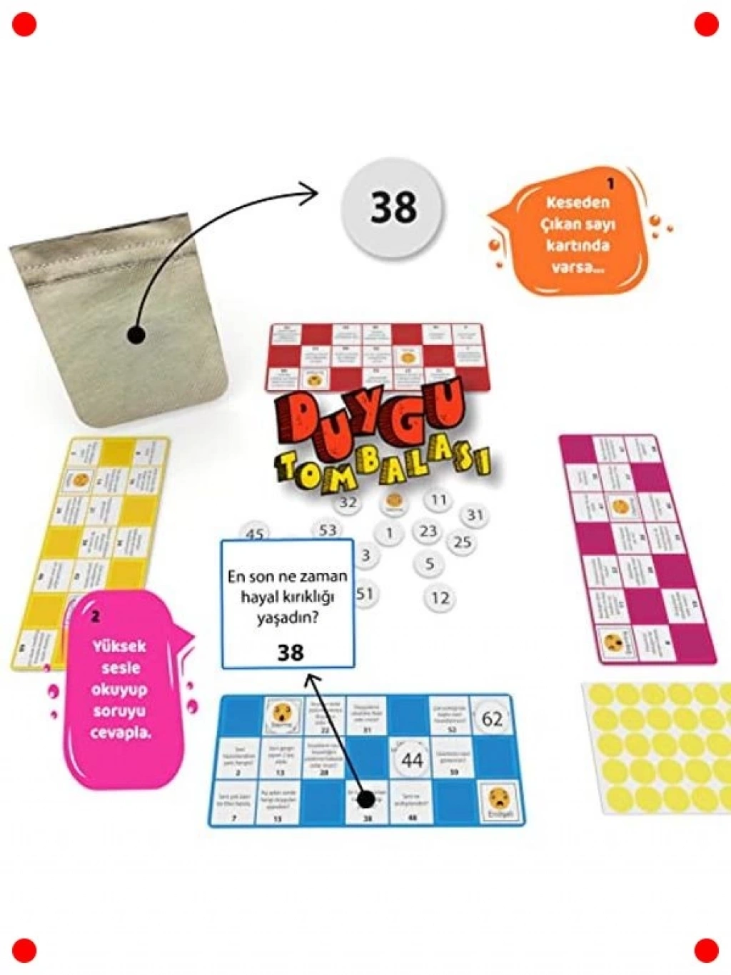 Çocukların duygusal zekalarını eğlenerek geliştirmeleri için tasarlanmış "Duygu Tombalası" ile tanışın! Bu eğitici kutu oyunu, çocukların farklı duyguları tanımalarına, adlandırmalarına ve ifade etmelerine yardımcı olur. Oyun kartlarındaki çeşitli yüz ifadeleri ve durumlar sayesinde çocuklar, neşe, üzüntü, öfke veya şaşkınlık gibi temel duyguları görsel olarak öğrenirler. Aile içinde veya okullarda kullanıma uygun olup, çocukların sosyal becerilerini ve empati yeteneklerini geliştirir. Hem eğlenceli hem de öğretici bu oyun, çocukların duygusal farkındalıklarını artırarak daha sağlıklı iletişim kurmalarına katkıda bulunur.