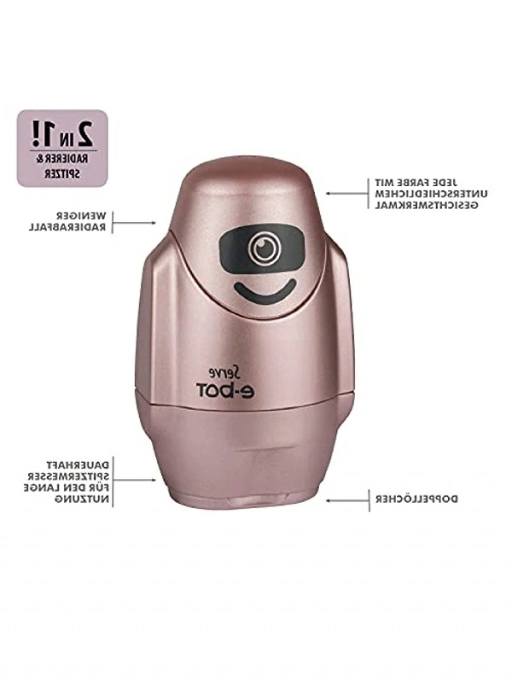 E-Bot silgili kalemtıraş, metalik roze rengiyle dikkat çekiyor. Silgi ve kalemtiraşın bir arada kullanımıyla pratikliği ön planda tutar. Toz ve iz bırakmayan silgi özelliği ile temiz kullanım sağlar. Her rengin üzerinde yer alan farklı robotik yüz ifadeleri, eğlenceli bir deneyim sunar.