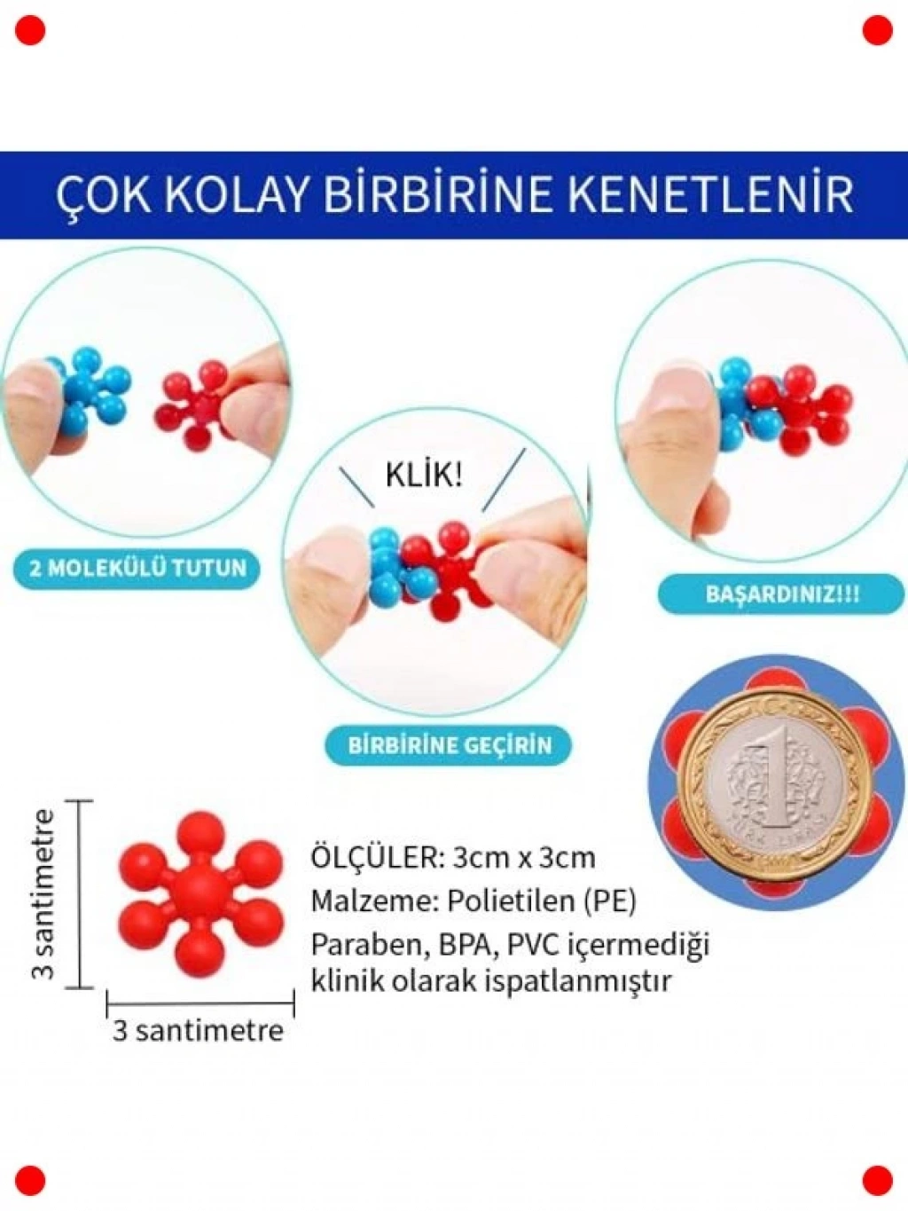 Çocukların ve gençlerin kimya dünyasına eğlenceli bir giriş yapmasını sağlayan 120 parçalı eğitici molekül yapı seti. Bu set, temel molekül yapılarını ve kimyasal bağları görsel ve uygulamalı bir şekilde öğrenmek için idealdir. Beş farklı renkteki küreler (atomları temsil eder) ve bağlantı çubukları (bağları temsil eder) sayesinde öğrenciler kendi molekül modellerini oluşturabilir. STEM eğitimiyle uyumlu bu oyuncak, yaratıcılığı, problem çözme becerilerini ve bilimsel düşünmeyi teşvik eder. Güvenli ve dayanıklı malzemelerden üretilmiştir. Hem evde hem de sınıfta bilimsel kavramları pekiştirmek için harika bir araçtır.