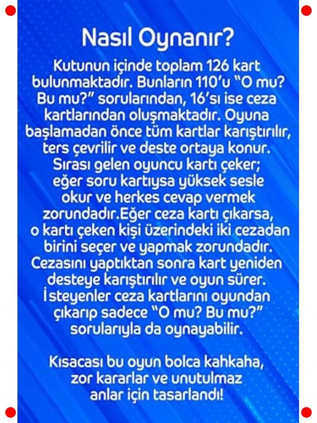 Arkadaşlarınızla veya ailenizle keyifli vakit geçirmek için tasarlanmış bu sosyal kutu oyunu ile eğlenceyi doruklara taşıyın. Kolay öğrenilen kuralları sayesinde herkesin hemen oyuna dahil olabileceği bu oyun, samimi sohbetleri ve kahkahaları garanti eder. Partiler, ev toplantıları, kafe ortamları veya sadece günlük bir buluşma için idealdir. Oyuncular arasında etkileşimi artıran, zekanızı ve mizah anlayışınızı konuşturmanızı sağlayan eğlenceli sorular ve görevler içerir. Stres atmak ve sevdiklerinizle unutulmaz anılar biriktirmek için harika bir seçimdir. Hem eğlenceli hem de sosyal bağları güçlendiren mükemmel bir oyun deneyimi sunar.