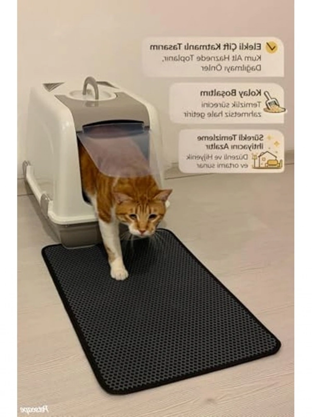Elekli kedi tuvalet önü paspası, 60x42 cm boyutları ile kedi kumunun etrafa yayılmasını önler. Sert plastikten üretilmiş yapısı, kumların etkili bir şekilde alt haznede toplanmasına olanak tanır.