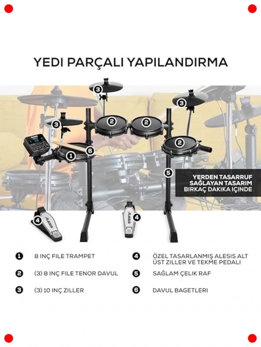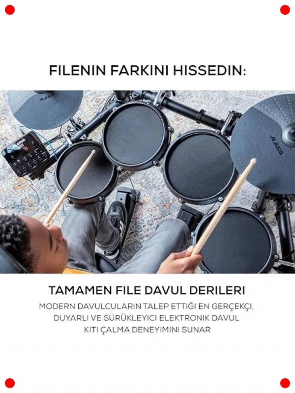Davul çalmaya başlamak için mükemmel bir set! Bu elektronik davul seti, yeni başlayanlar için özel olarak tasarlanmıştır. Sessiz 8 inçlik örgü (mesh) pedleri sayesinde gerçekçi bir davul deneyimi sunarken, evde gürültü yapmadan pratik yapma imkanı sağlar. 100'den fazla farklı ses ve yerleşik derslerle müzikal gelişiminizi destekler. Set içerisinde davul bagetleri ve bağlantı kabloları da bulunmaktadır, böylece kutudan çıkar çıkmaz çalmaya başlayabilirsiniz. Kompakt tasarımıyla az yer kaplar ve kolayca kurulur, müzik yolculuğunuza hemen başlayın!