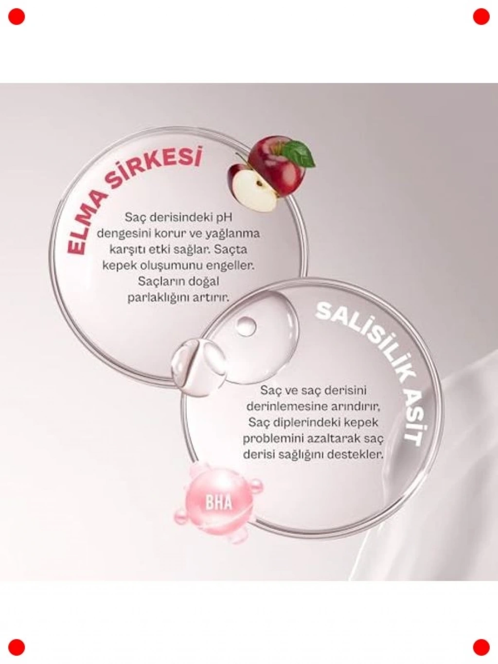 Kepek sorununa karşı özel olarak formüle edilmiş bu saç bakım şampuanı, elma sirkesi ve salisilik asit içeriği ile saç derinizi derinlemesine temizler. Saç derisindeki fazla yağı ve kepek oluşumuna neden olan pullanmayı nazikçe arındırır. Düzenli kullanımda saç derisinin doğal dengesini sağlamaya yardımcı olur, kaşıntı ve tahriş hissini azaltır. Saçlarınızı ağırlaştırmadan temizler, ferah ve canlı bir görünüm kazandırır. Sağlıklı bir saç derisi, güçlü ve parlak saçların anahtarıdır. Hem saç derinizi rahatlatın hem de saçlarınızın temiz ve bakımlı olmasını sağlayın.