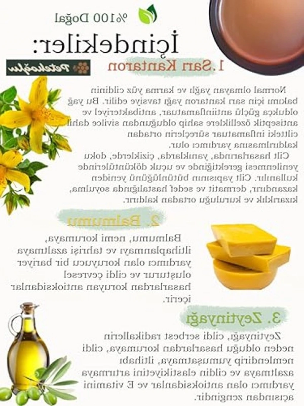Elyapımı sarı kantaron yağı kremi, 50 ml'lik hacmiyle doğal bir cilt bakımı sağlar. İçeriğindeki balmumu, zeytinyağı ve kantaron yağı, cildi besleyici özelliklere sahiptir.