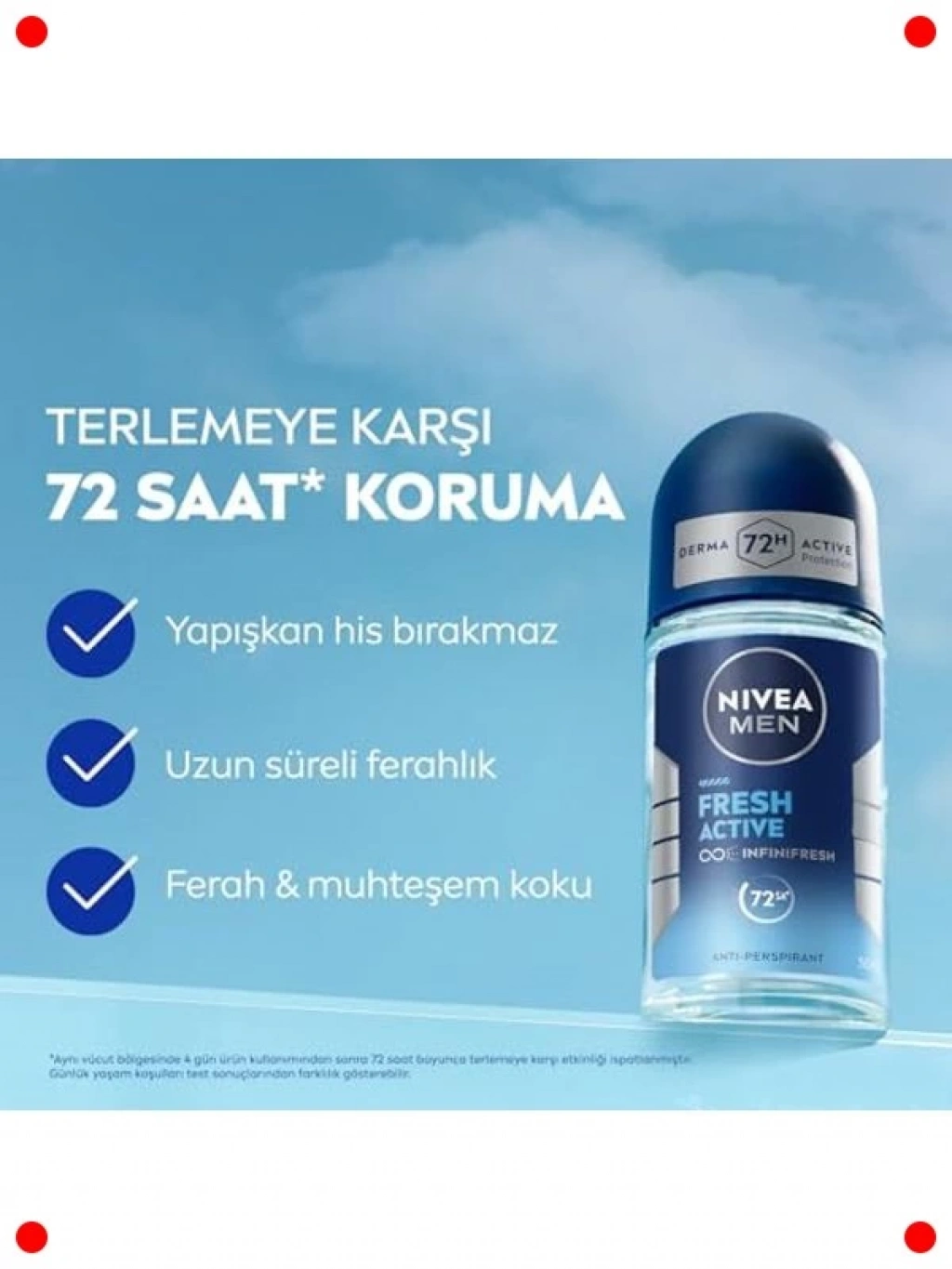 Erkeklere özel olarak geliştirilmiş bu roll-on deodorant, terlemeye karşı 72 saate kadar etkili koruma sağlar. Okyanus özleri esintili ferah kokusuyla gün boyu kendinizi zinde hissetmenizi destekler. Ciltte yapışkan bir his bırakmayan özel formülü, konforlu bir kullanım sunar. Etil alkol içermeyen yapısıyla cildinize nazik davranır ve hassasiyet riskini azaltır. Hızlı kuruyan yapısı sayesinde giysilerinizde leke bırakmaz. Her an, her yerde güvenle kullanabileceğiniz bu deodorant, aktif yaşam tarzınıza uyum sağlayarak sizi taze ve korumalı tutar.