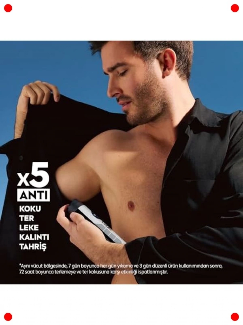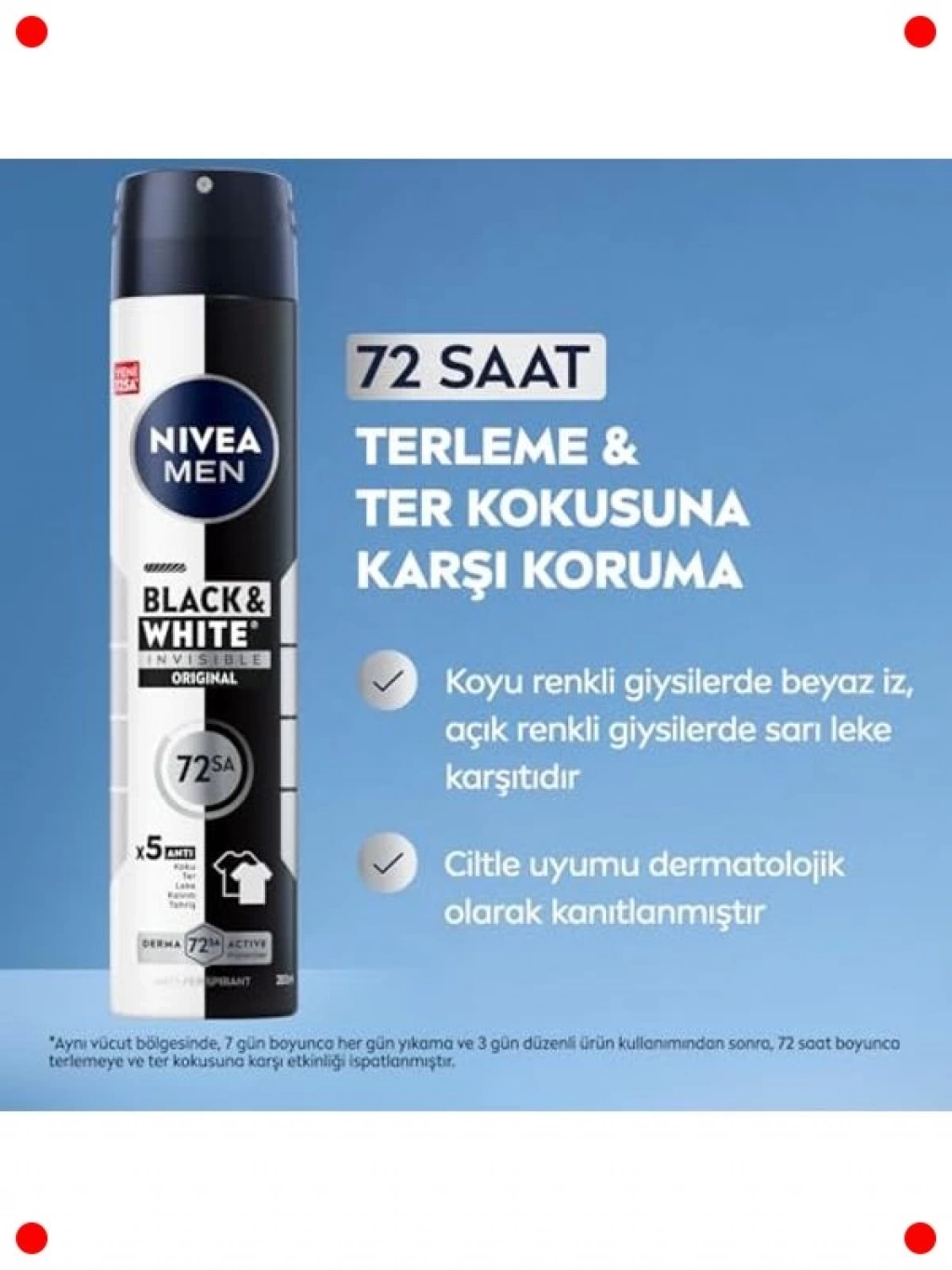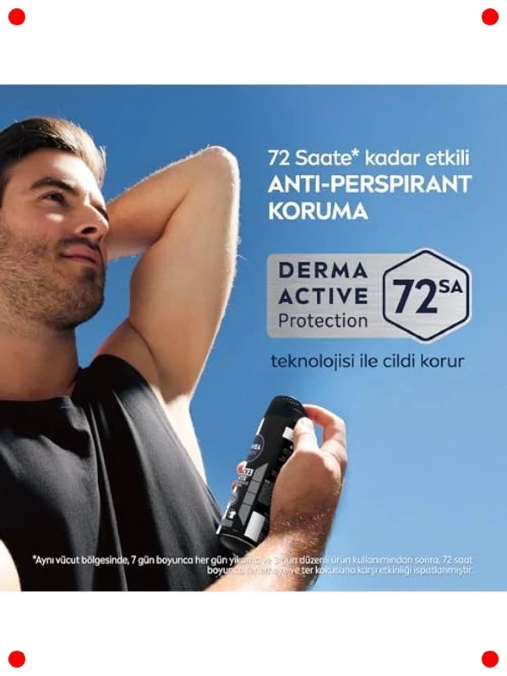 Erkekler için özel olarak geliştirilmiş bu sprey deodorant, 72 saate kadar etkili anti-perspirant koruma sağlayarak terlemeyi ve kötü kokuyu kontrol altına alır. Gelişmiş formülü sayesinde, kıyafetlerinizde beyaz iz veya sarı leke bırakmaz, böylece giysilerinizin rengini korur. Uzun süreli ferahlık hissi verirken, cildinize nazik davranır ve tahrişi önler. Hızlı kuruyan yapısı sayesinde sabahları hemen giyinmenizi sağlar. Güven veren etkisiyle gün boyu kendinizi temiz ve dinamik hissetmenizi destekler. 200 ml'lik ekonomik boyutuyla uzun süreli kullanım imkanı sunar.