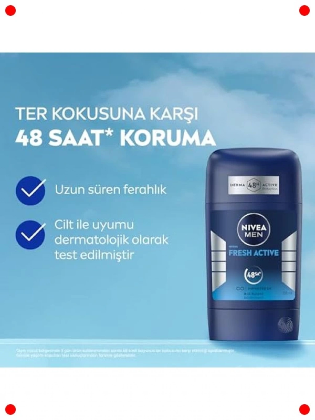 Erkeklere özel olarak formüle edilmiş bu stick deodorant, ter ve ter kokusuna karşı 48 saat etkili koruma sağlar. Fresh Active formülü, okyanus özleriyle zenginleştirilmiştir ve gün boyu süren ferahlatıcı bir koku sunar. Alüminyum içermeyen yapısı sayesinde cildinize nazik davranır ve doğal terleme sürecinizi engellemez. Kolay uygulanan stick formu, hızlı ve pratik bir kullanım sunar. Cildinizde leke bırakmaz ve kıyafetlerinizde iz oluşturmaz. Her an kendinize güvenli ve ferah hissetmek için ideal bir çözümdür.
