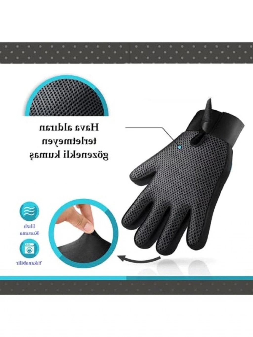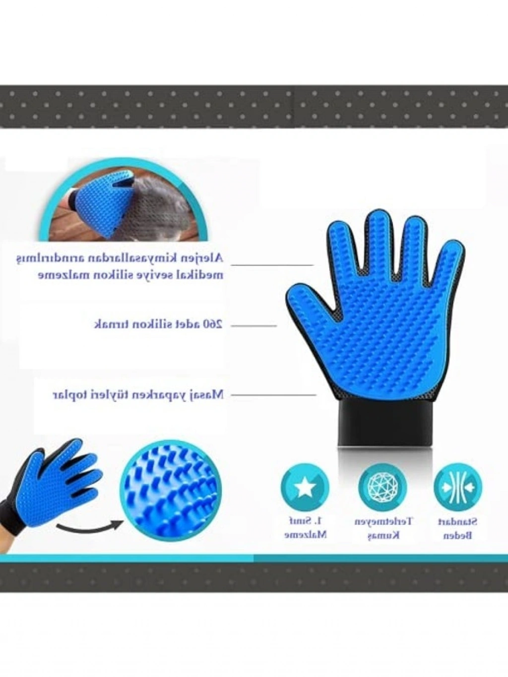 Evcil hayvan tüy toplama eldiveni, kaşıma ve tarama işlemleri için uygun bir üründür. Tüm saç tipleri için kullanılabilir ve köpeklerle etkili bir şekilde tüy bakımını sağlar.