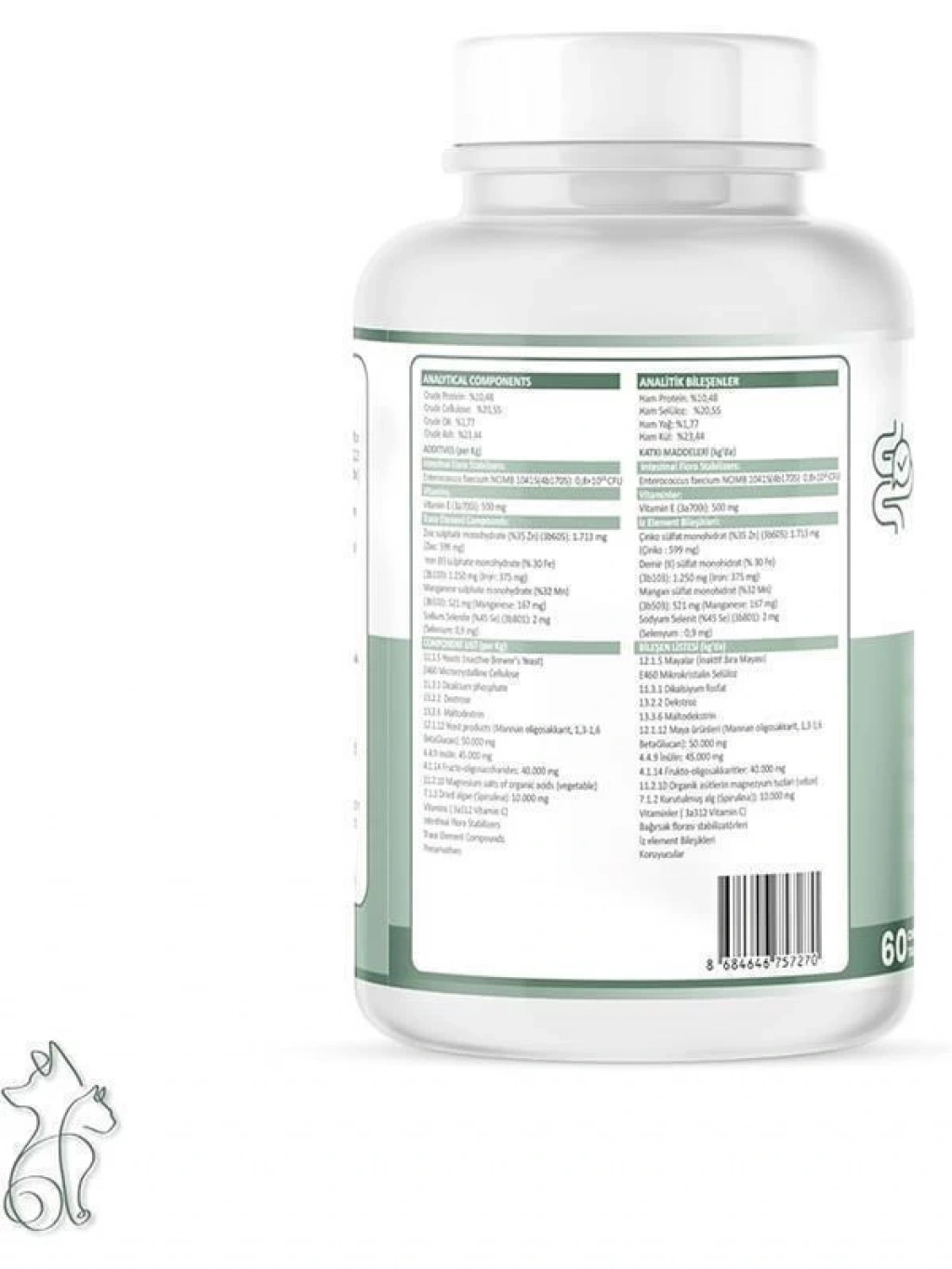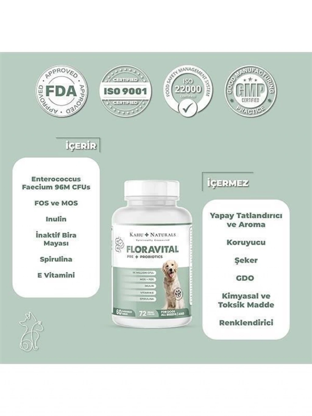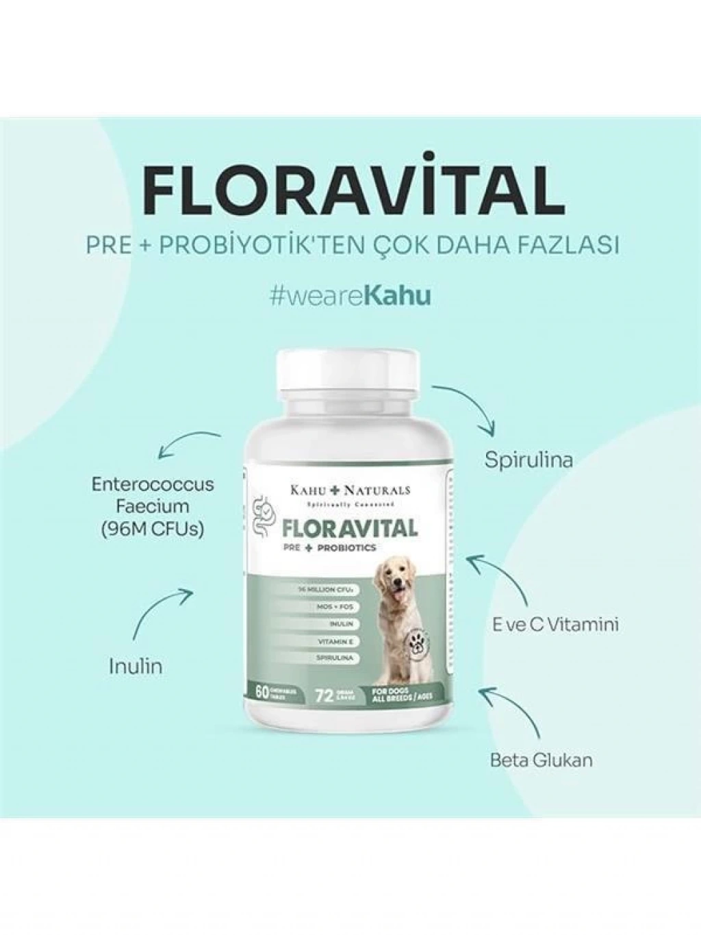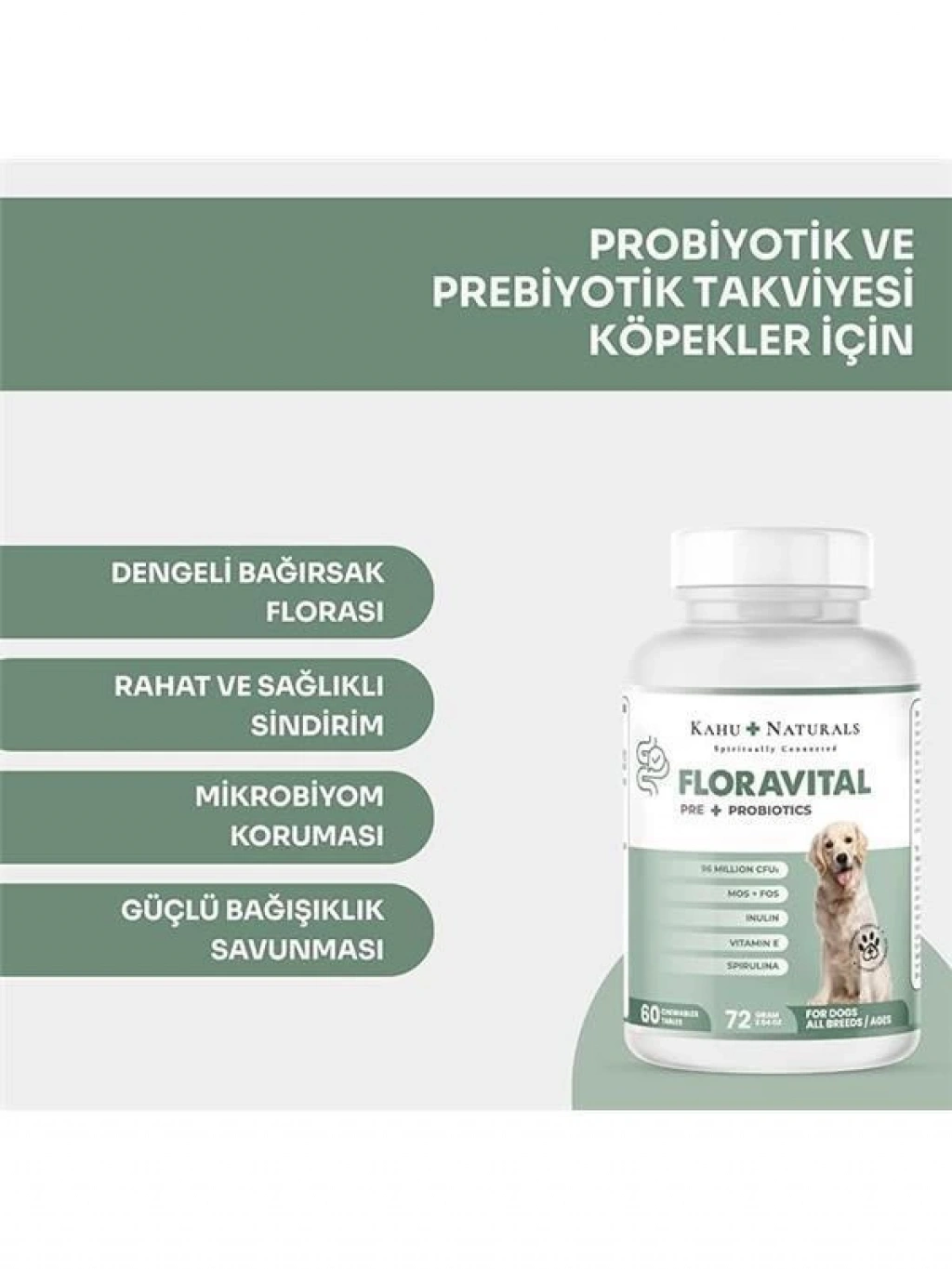 Bu ürün hakkında Naturals FloraVital yüksek orandaki Probiotik ve Prebiyotik içeriği sayesinde florayı dengeleyerek gastrointestinal sistemi destekler Yüksek antioksidan içeriği ile genel sağlığı destekler ve vücut direncini artırır Spirulina gibi süper gıdalarla zenginleştirilmiş formülü köpek dostlarımızın canlılığını artırır Enterococcus Faecium (96M CFUs) FloraVitalin ana maddesi olan faydalı probiyotikler köpeklerin bağırsak florasını dengeleyerek gastrointestinal sistemin sağlığını destekler FOS (FruktoOligosakkaritler) ve MOS (MannanOligosakkaritler) Prebiyotik lifler olarak bilinen FOS ve MOS bileşenleri ile gastrointestinal sistemdeki yararlı bakterilerin çoğalması teşvik edilir İnulin Bir diğer prebiyotik lif olan inulin gastrointestinal sistem sağlığını iyileştirir rahatlatır ve besin emilimini artırır Spirulina Spirulina zengin besin içeriğiyle bilinen bir süper gıdadır Antioksidanlar proteinler vitaminler ve mineraller bakımından zengindir bu da köpeklerin genel sağlığını destekler ve enerji seviyesini artırır İnaktif Bira Mayası B vitaminleri açısından zengin olan inaktif bira mayası köpeğinizin enerji seviyesini artırır ve deri ile tüy sağlığını destekler Aynı zamanda vücudun sistemini güçlendirmeye yardımcı olur