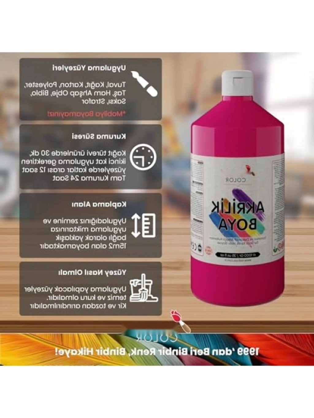 1000 gr hacmindeki fuşya akrilik boya, sanat projeleriniz için ideal bir malzemedir. Yüksek kaliteli yapısı sayesinde dayanıklıdır ve uzun süreli kullanım imkanı sunar. Farklı yüzeylerde mükemmel sonuçlar verirken, hızlı kuruma özelliği ile de rahat bir uygulama sağlar. Canlı renkleri ile projelerinizi daha etkili hale getirir ve yaratıcı fikirlerinizi hayata geçirmenizi kolaylaştırır.
