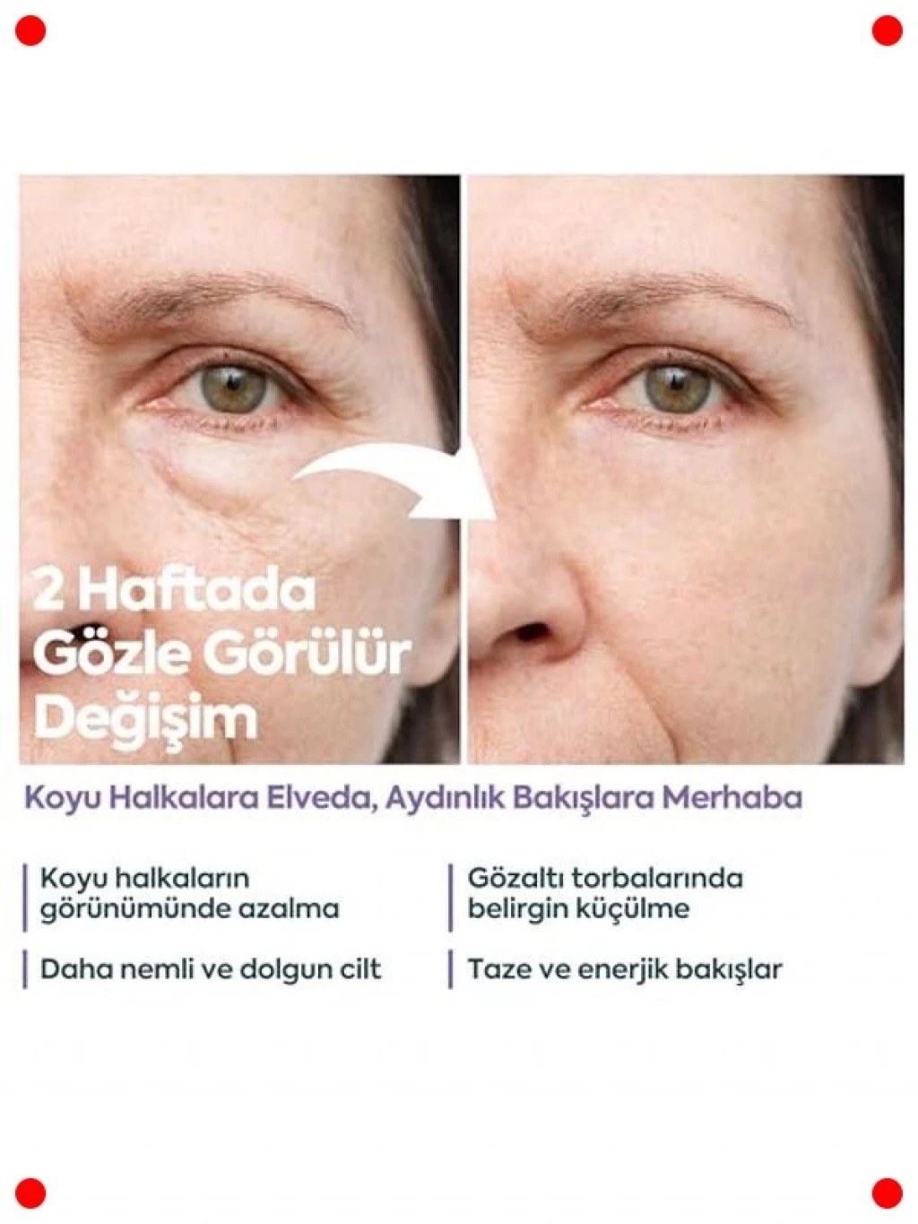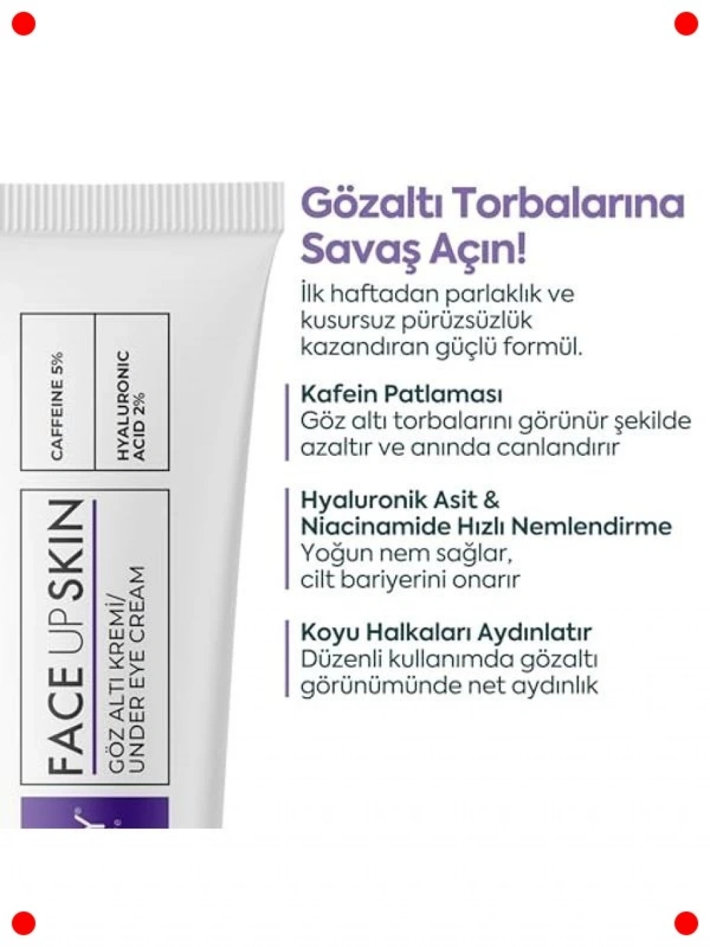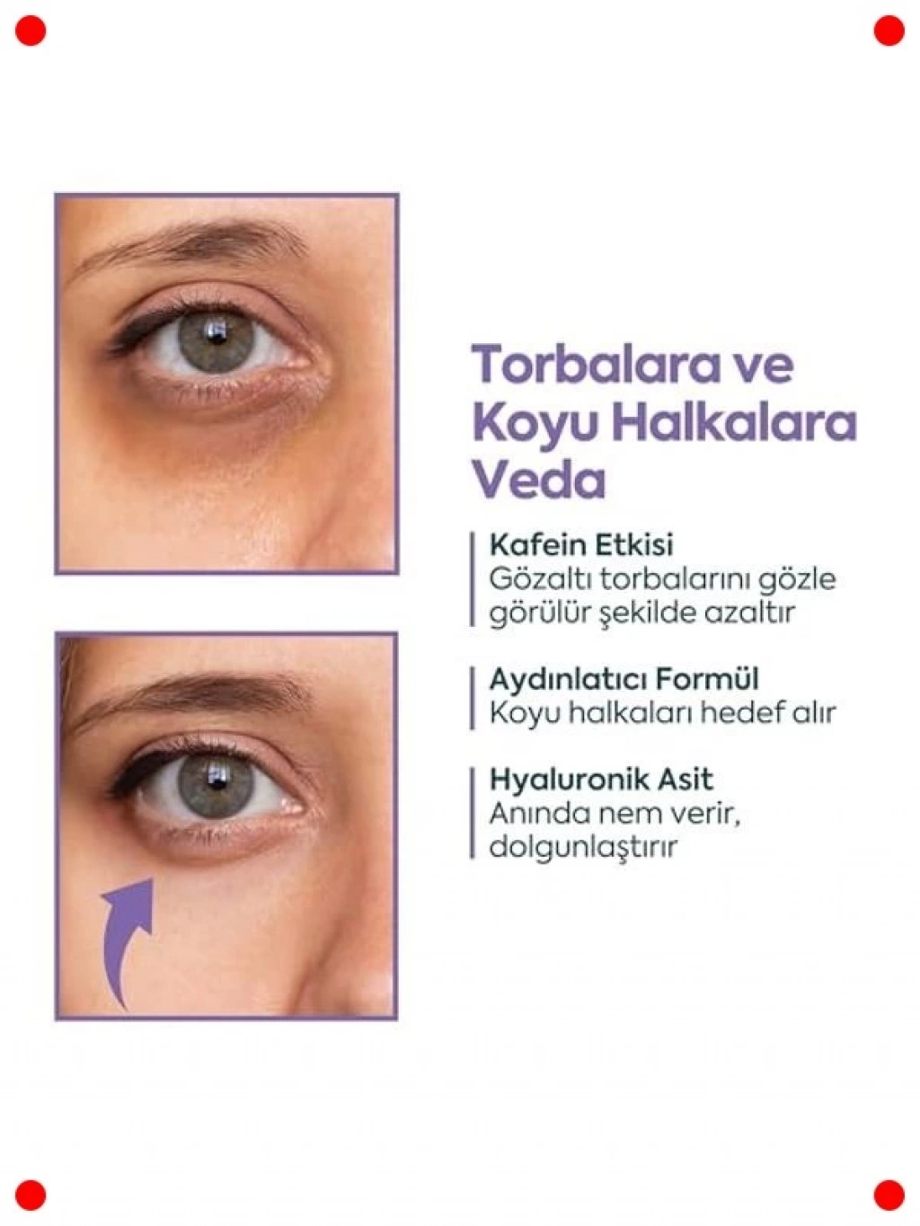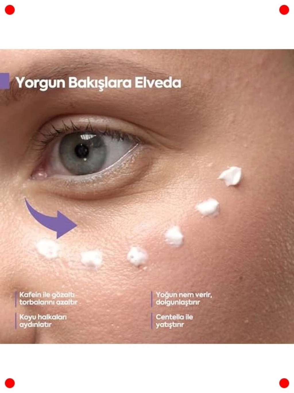 Göz çevresindeki hassas cilt için özel olarak geliştirilmiş bu krem, kafein ve hyaluronik asit içerikli zengin formülüyle dikkat çeker. Göz altı morluklarının, torbalanmaların ve şişliklerin görünümünü azaltmaya yardımcı olurken, cilde yoğun nem sağlar. İnce çizgi ve kırışıklıkların oluşumunu engellemeye destek olarak daha pürüzsüz bir göz çevresi vadeder. Cildi aydınlatarak daha dinlenmiş ve canlı bir bakış kazandırır. Hızlı emilen yapısıyla makyaj altına da rahatlıkla uygulanabilir, göz çevrenizi nazikçe besler ve korur.