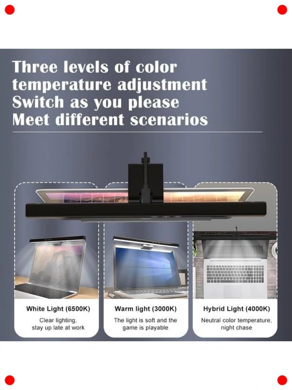 Uzun çalışma veya oyun saatlerinde gözlerinizi koruyun. Bu 50 cm uzunluğundaki LED monitör lambası, ekran yansımasını önleyerek göz yorgunluğunu azaltır. 3 farklı renk sıcaklığı (3000K-6500K) ve ayarlanabilir parlaklık seviyeleri sayesinde çalışma ortamınızı kişiselleştirebilirsiniz. Monitör üzerine kolayca takılır ve USB ile güç alır. Mavi ışık filtresi ve titreşimsiz aydınlatma teknolojisi ile konforlu bir görsel deneyim sunar. Verimliliğinizi artırırken, göz sağlığınızı da destekler.
