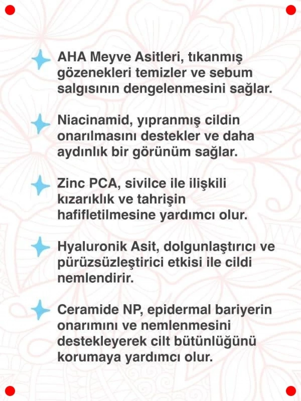Cildinizi dış etkenlerden korurken, gözenek görünümünü hedefleyen ve sivilce oluşumuna karşı etkili bir çözüm sunan bu serumu keşfedin. %2 Salisilik Asit içeren formülü sayesinde, cildin derinlemesine temizlenmesine, gözeneklerin sıkılaşmasına ve aşırı yağlanmanın dengelenmesine yardımcı olur. Özellikle yağlı ve karma cilt tipleri için idealdir. Düzenli kullanımda cilt tonunu eşitlemeye ve daha pürüzsüz bir cilt yüzeyi oluşturmaya katkıda bulunur. Anti-polüsyon özellikleri sayesinde çevresel faktörlerin cilt üzerindeki olumsuz etkilerini azaltır. Temiz ve arınmış bir cilt hissiyle özgüveninizi tazeleyin.
