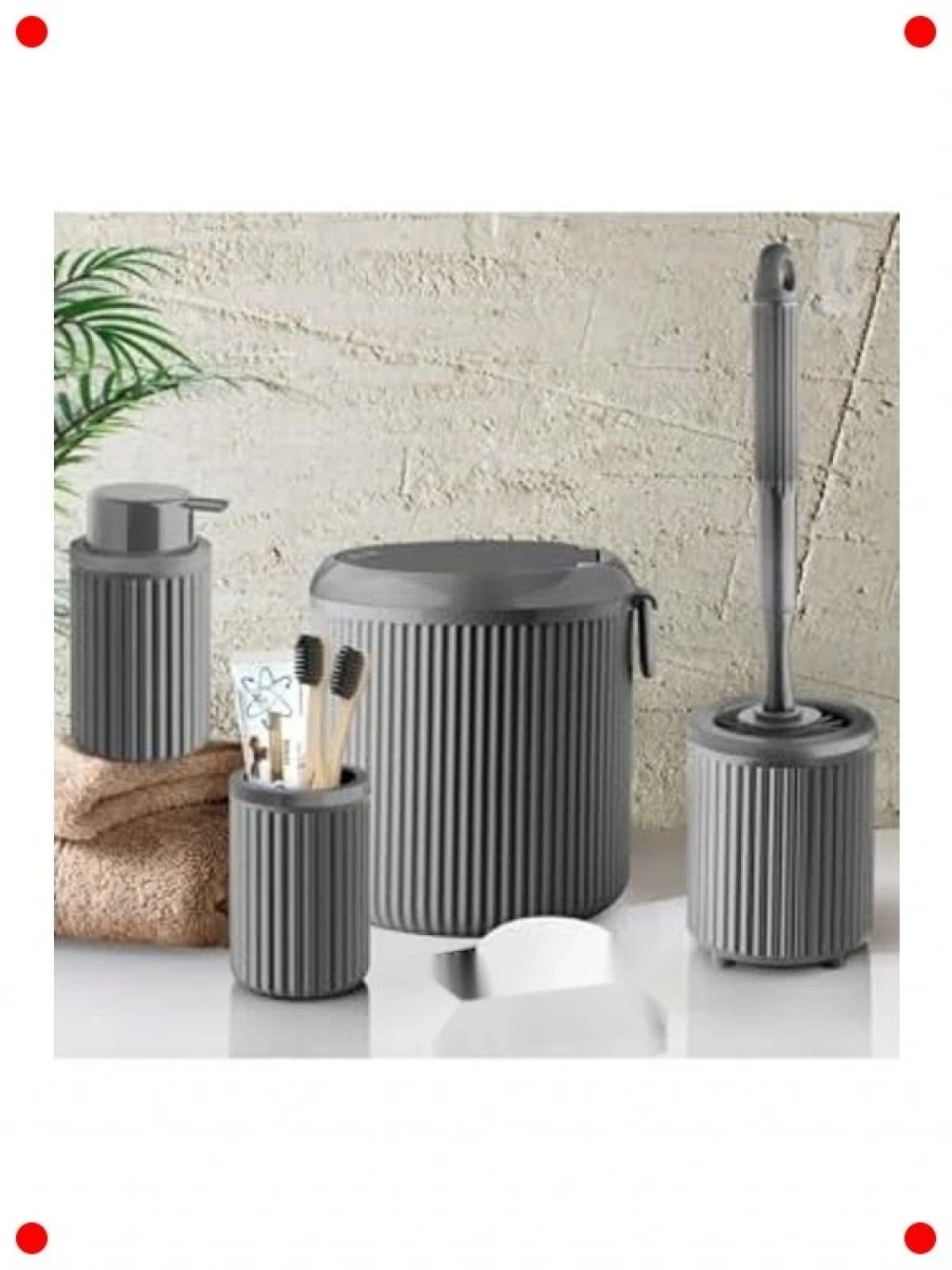 Banyonuz için şıklık ve işlevselliği bir araya getiren bu gri 5 parçalı set ile düzeni yakalayın. Modern tasarımı ve uyum renkleriyle her banyoya kolayca pte or. Set içerisinde 4 litrelik kullanışlı bir çöp kovası, hijyenik bir tuvalet fırçası, pratik bir sıvı sabunk, düzenli bir diş fırçalık ve zarif bir katı sabunk bunmaktadır. Bu tam takım set, banyo ihtiyaçlarınızı eksiksiz karşılarken, dağınıklığı ortn kaldırarak ferah ve estetik bir görünüm sağlar. Kaliteli ve dayanıklı malzemelerden üretilş op uzun ömürlü kullanım sunar, banyonuzda modern bir ha estirir.