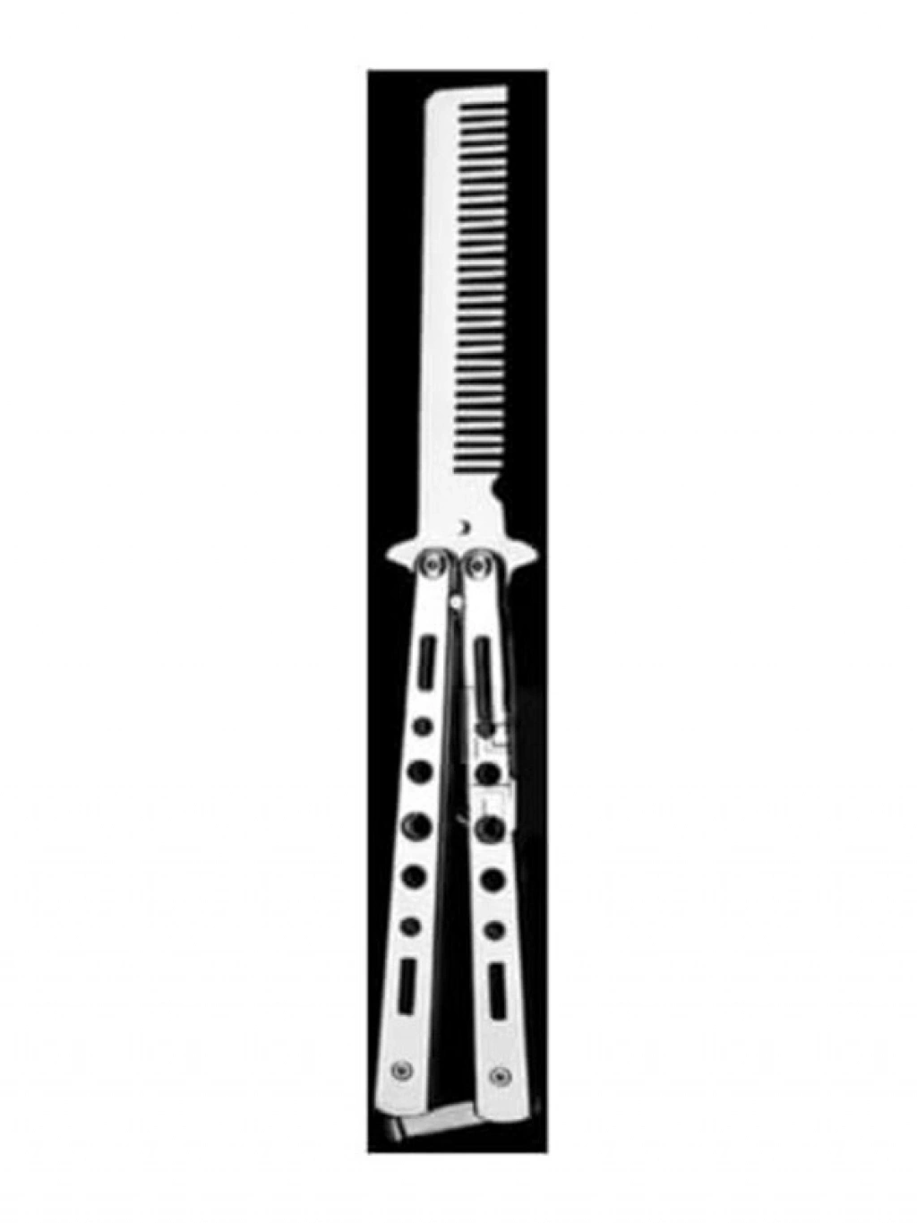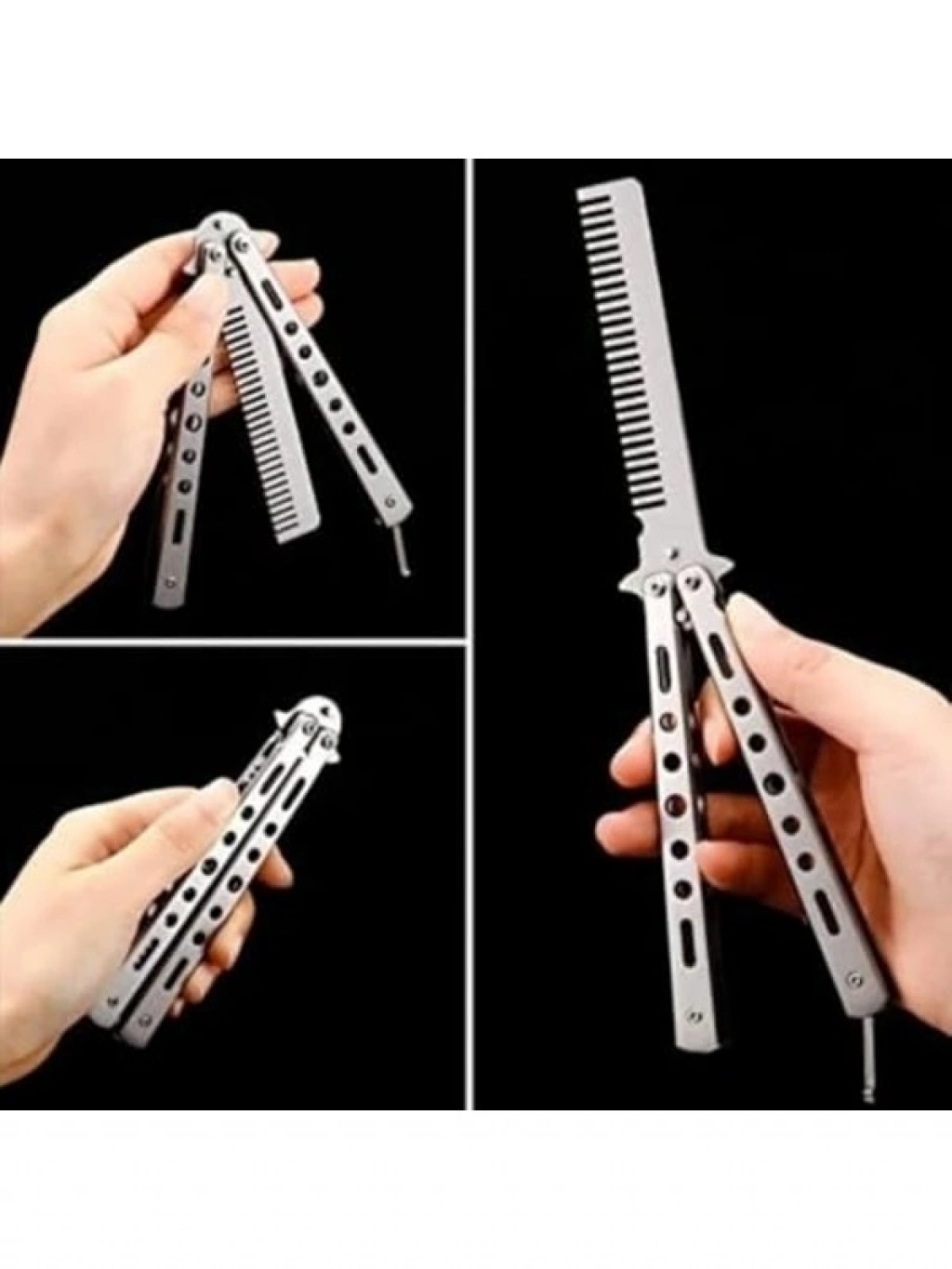 Gri kelebek bıçak tarak, paslanmaz çelikten üretilmiştir ve katlanabilir özelliği ile pratik bir kullanım sağlar. Profesyonel saç kesimi için ideal olan bu tarak, sakal ve bıyık bakımı için de tercih edilmektedir.