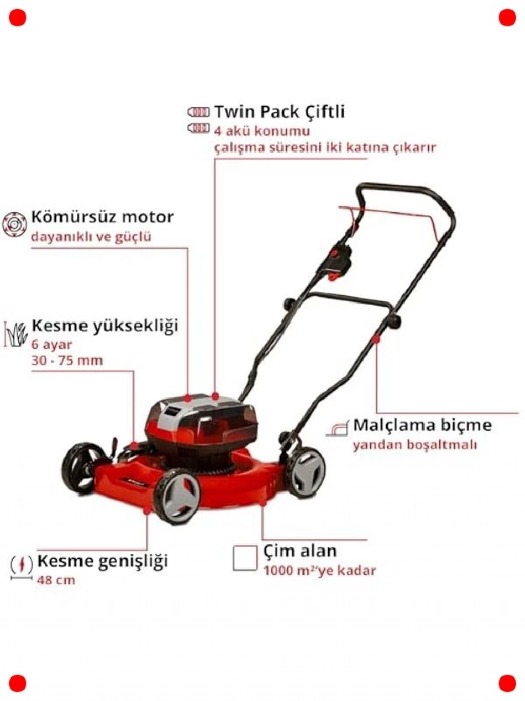 Geniş çim alanlar için tasarlanmış bu akülü çim biçme makinesi ile bahçe bakımınız artık daha kolay ve çevre dostu. 36 V gücü ve 48 cm kesme genişliği sayesinde 1000 m²'ye kadar alanları tek şarjda biçebilirsiniz. Kömürsüz motor teknolojisi, daha uzun ömür ve daha yüksek verimlilik sunar. Entegre malçlama fonksiyonu, biçilen çimleri toprağa besin olarak geri kazandırır. 30-75 mm arasında ayarlanabilir kesme yüksekliği ile istediğiniz çim boyunu elde edin. Kablosuz özgürlüğün tadını çıkarın.