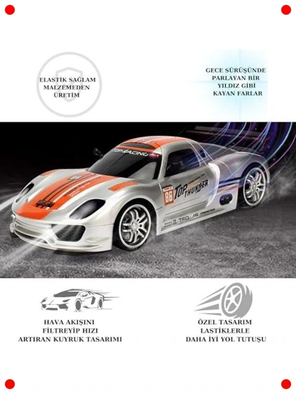 Adrenalin ve hız tutkunları için tasarlanmış bu gümüş renkli uzaktan kumandalı ralli araba ile heyecan verici yarışlara hazır olun. 2.4 GhZ teknolojisi sayesinde parazitsiz ve kesintisiz bir sürüş deneyimi sunar. Şarj edilebilir bataryası ile uzun süreli eğlence garantiler. Göz alıcı LED ışıkları, özellikle karanlıkta sürüş yaparken arabanıza fütüristik bir hava katar. Full fonksiyonel kontrolü sayesinde kolayca yönlendirilebilir. Çocukların el-göz koordinasyonunu ve reflekslerini geliştirirken, onlara gerçek bir yarış deneyimi yaşatır.