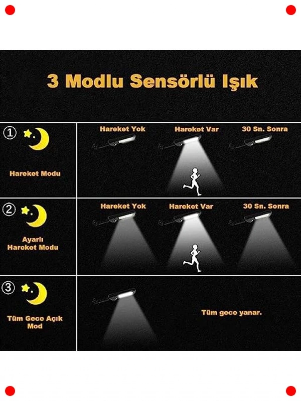 Bahçenizi, garajınızı veya yolunuzu aydınlatmak için ideal olan bu güneş enerjili 120 LED aydınlatma ile hem enerji tasarrufu yapın hem de güvenliği artırın. Uzaktan kumandalı ve hareket sensörlü yapısıyla kullanım kolaylığı sunar. Gece sensörü sayesinde otomatik olarak devreye girer ve hareket algıladığında daha parlak yanar. Kablolama gerektirmeyen kolay kurulumu sayesinde istediğiniz yere monte edebilirsiniz. Hava koşullarına dayanıklı yapısıyla her mevsim dış mekanlarda güvenle kullanılabilir. Çevre dostu ve ekonomik bir aydınlatma çözümü arayanlar için mükemmel bir tercihtir. Dekoratif ve işlevsel bir üründür.