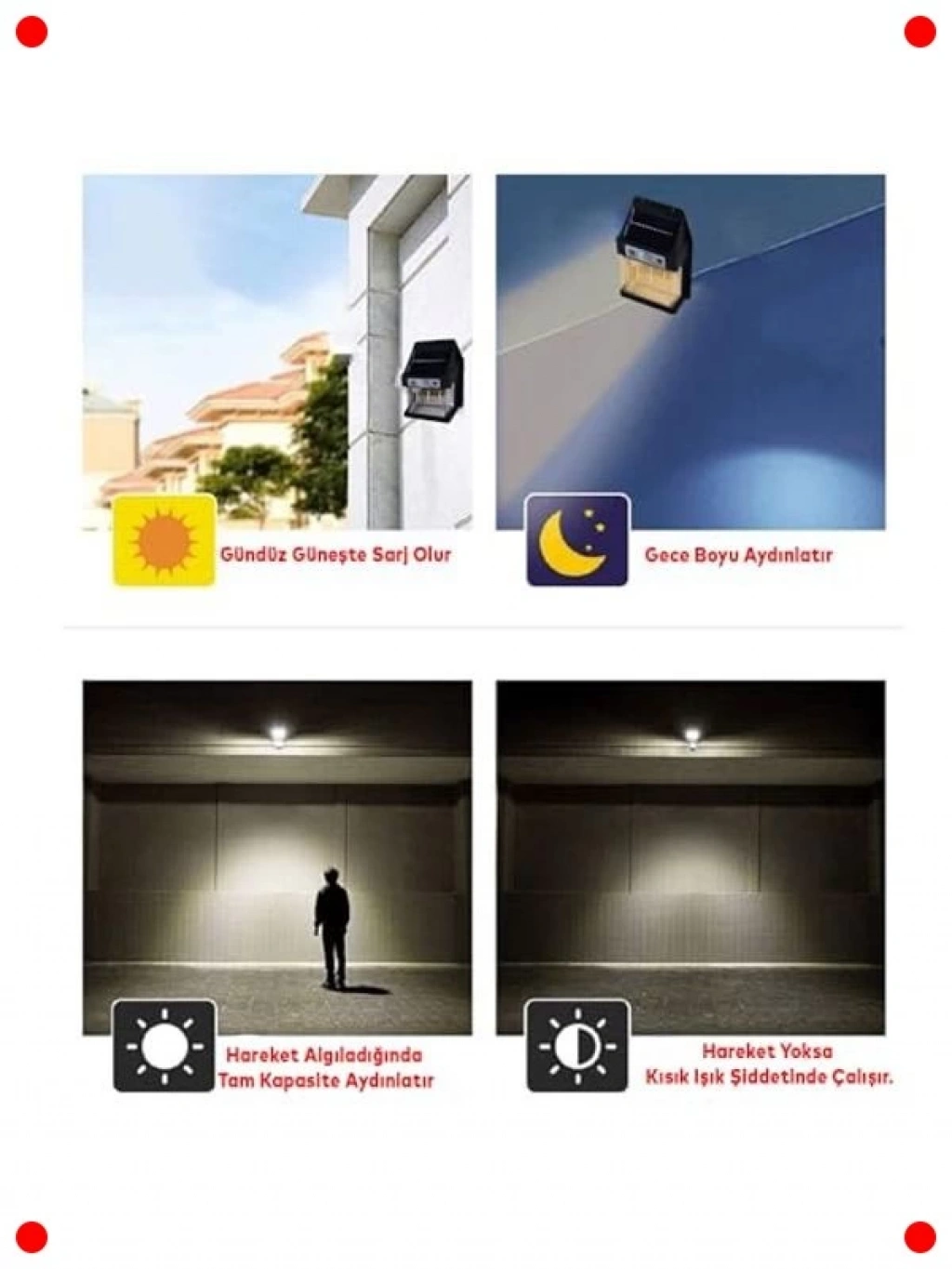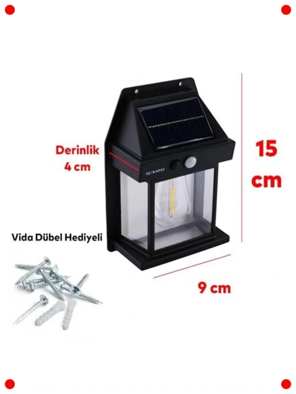Bahçeniz, terasınız veya girişiniz için ideal olan bu güneş enerjili dış aydınlatma çözümüyle hem enerji tasarrufu yapın hem de güvenliği artırın. 5W gücündeki bu aplik, parlak sarı ışık yayarak sıcak bir atmosfer oluşturur. Üç farklı aydınlatma modu ve entegre ışık sensörü sayesinde gün batımında otomatik olarak devreye girer ve enerji verimli bir şekilde çalışır. Kablosuz kurulumu ile dilediğiniz yere kolayca monte edilebilir. Dayanıklı yapısı sayesinde tüm hava koşullarına dayanıklıdır. Estetik görünümüyle dış mekan dekorasyonunuza modern bir dokunuş katarken, portatif fener özelliğiyle esnek kullanım imkanı sunar.
