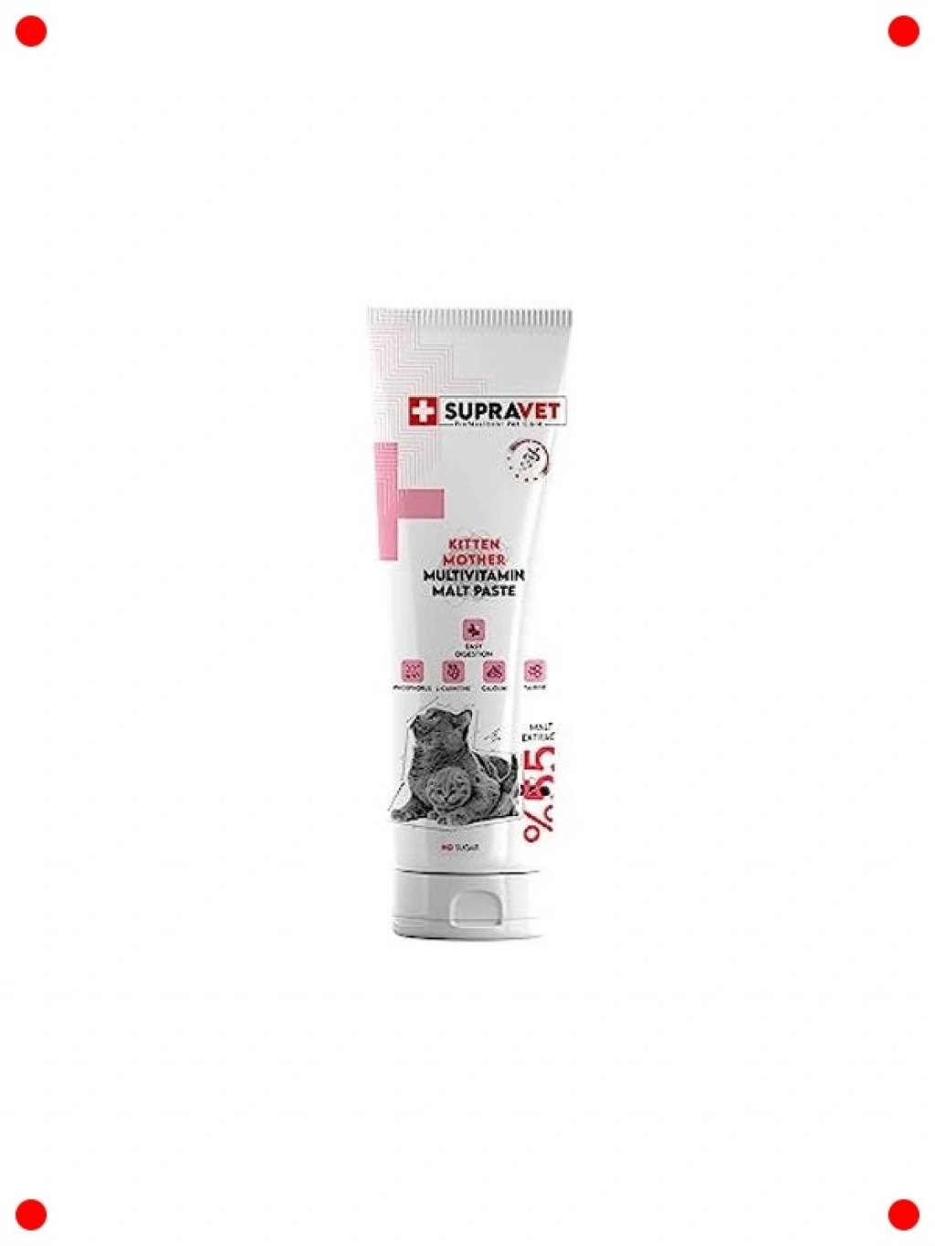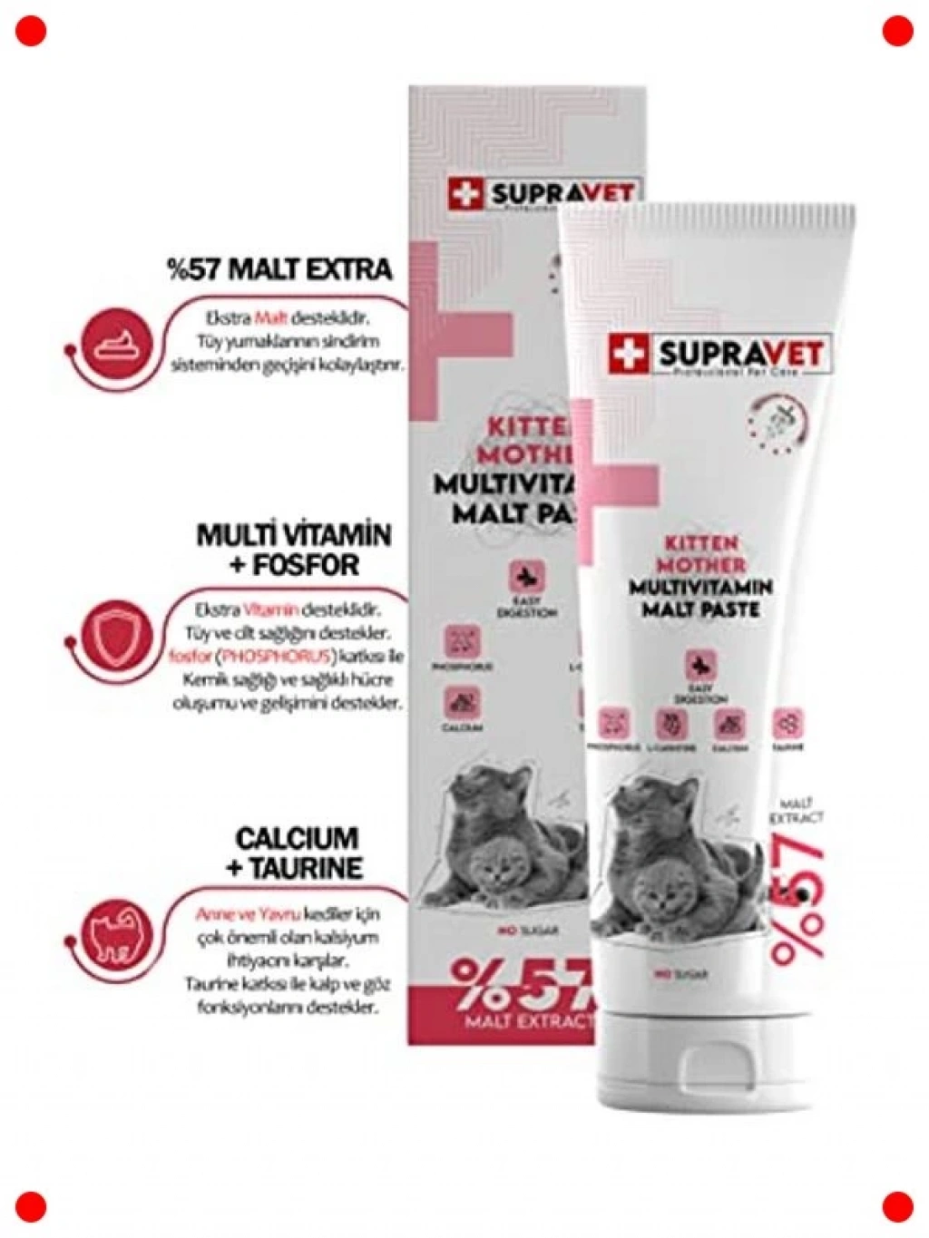 Hamile ve emziren kedilerin yanı sıra yavru kedilerin sağlıklı büyüme ve gelişimini desteklemek için özel olarak formüle edilmiş multivitamin macun. 100 gramlık bu ürün, kalsiyum ve taurin gibi temel besin maddeleriyle zenginleştirilmiştir. Kalsiyum, güçlü kemik ve diş gelişimi için hayati öneme sahipken, taurin göz ve kalp sağlığını destekler. %57 ekstra malt içeriği sayesinde tüy yumağı oluşumunu azaltmaya yardımcı olur. Kolayca verilebilen macun formu, kediler için lezzetli ve çekici bir takviyedir. Bağışıklık sistemini güçlendirir, enerji seviyesini artırır ve genel sağlığı destekler.