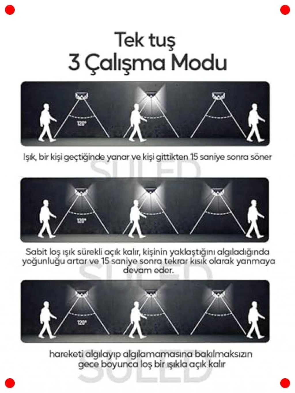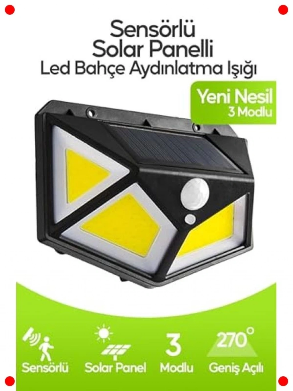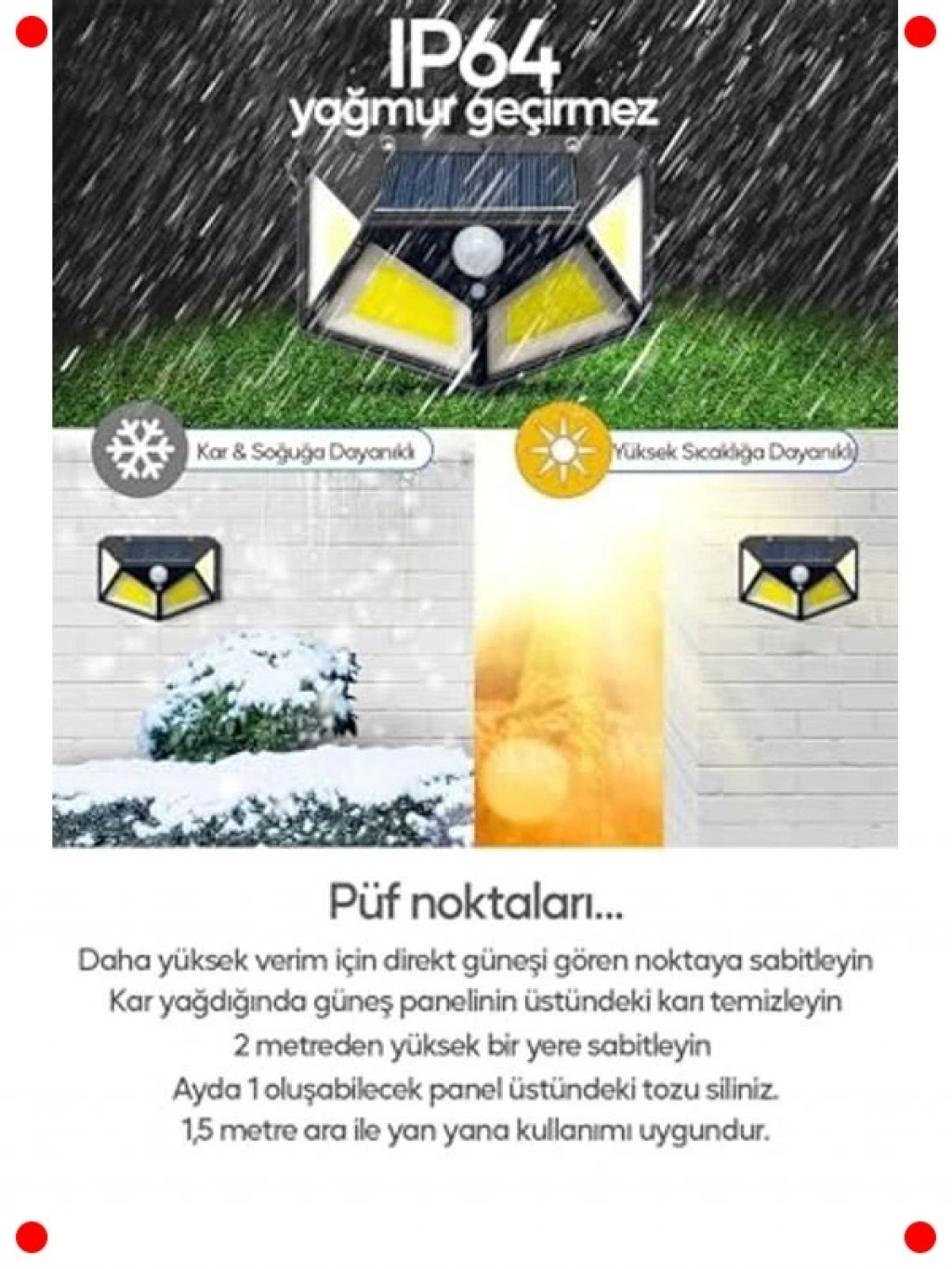 Bahçenizi, avlunuzu veya havuz kenarınızı güvenle ve enerji tasarrufuyla aydınlatan bu hareket sensörlü solar lamba ile tanışın. Güneş enerjisiyle otomatik olarak şarj olur ve hareket algıladığında güçlü COB ışığıyla çevreyi aydınlatır, böylece hem güvenlik sağlar hem de gereksiz enerji tüketimini önler. Dış mekan kullanımına uygun dayanıklı ve suya dayanıklı (IP dereceli) yapısı sayesinde zorlu hava koşullarına karşı dirençlidir. Kablosuz ve kolay kurulumu sayesinde herhangi bir elektrik tesisatına ihtiyaç duymaz, istediğiniz yere monte edebilirsiniz. Kamp, piknik veya tatil bölgeleri için de ideal bir aydınlatma çözümüdür.