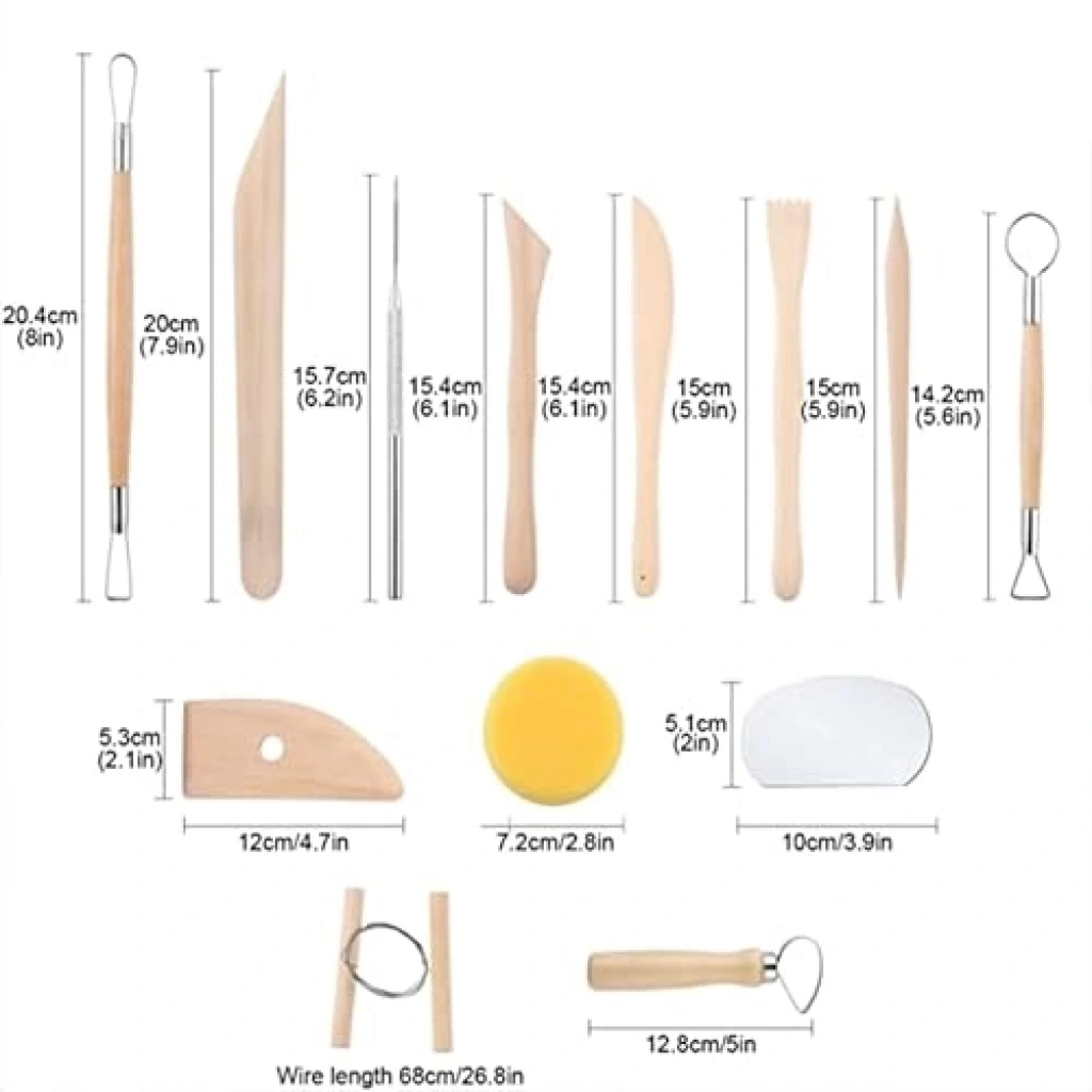 Hobi çömlek seti, 13 parçalı serak aletleri ile birlikte geliyor ve modelleme, oyma ve şekillendirme gibi işlemler için idealdir. Set içerisinde pürüzsüz ahşap saplar ve keskin paslanmaz çelik aletler bulunur. Doğal kil ile hemen çalışmaya başlayabileceğiniz bu set, yaratıcı projeleriniz için gerekli tüm malzemeleri sunar.