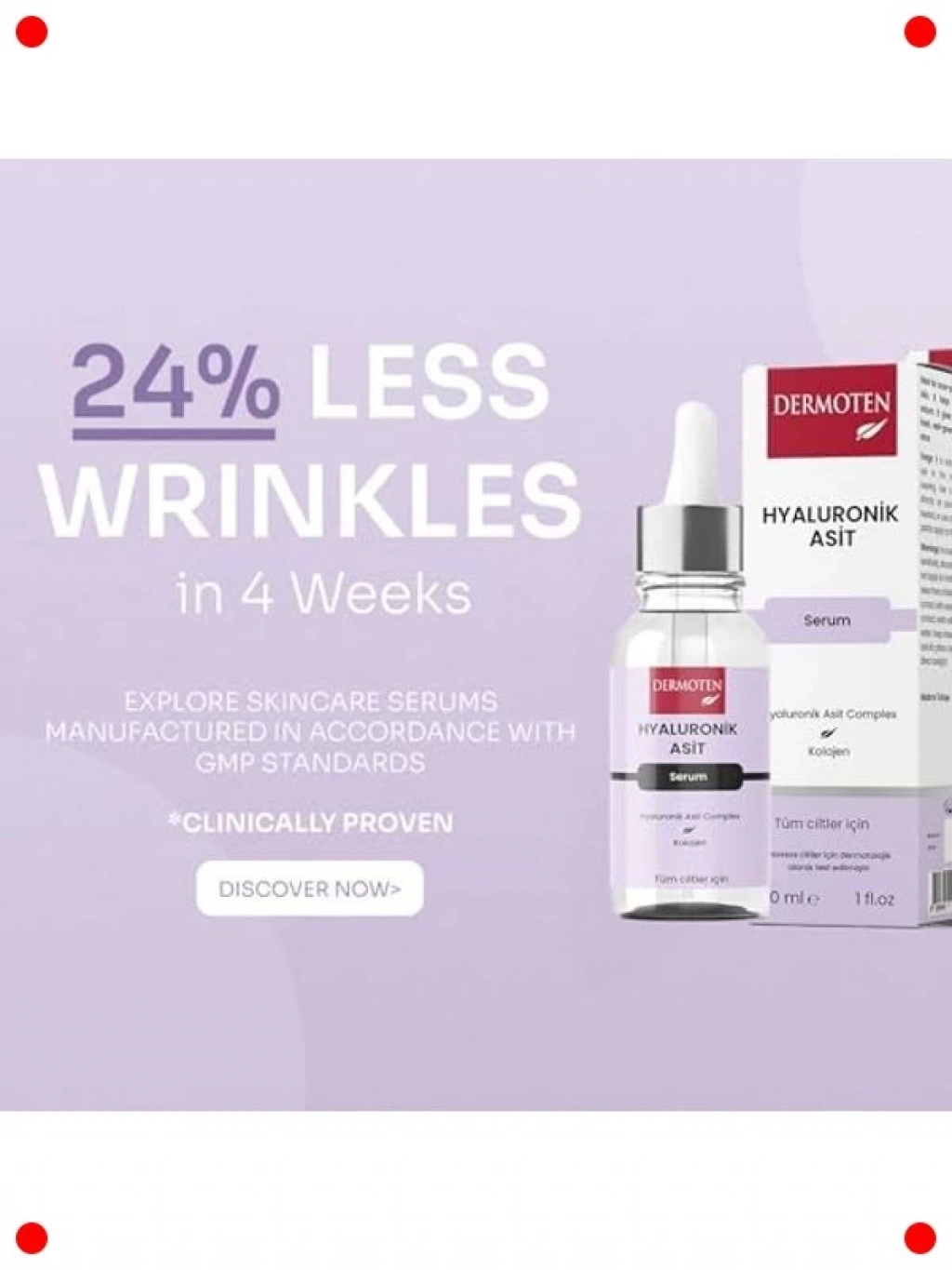 Cildinize yoğun ve derinlemesine nem sağlamak için özel olarak geliştirilen bu hyaluronik asit serumu, cildin su tutma kapasitesini artırarak daha dolgun ve pürüzsüz bir görünüm kazandırır. İnce çizgi ve kırışıklıkların görünümünü azaltmaya yardımcı olurken, cildin elastikiyetini artırır. Hızlı emilen ve hafif yapısıyla ciltte ağırlık yapmaz, yapışkan bir his bırakmaz. Tüm cilt tipleri için uygun olan bu serum, günlük cilt bakım rutininizin vazgeçilmezi olacak. Cildinizin daha canlı ve ışıltılı görünmesini sağlar.