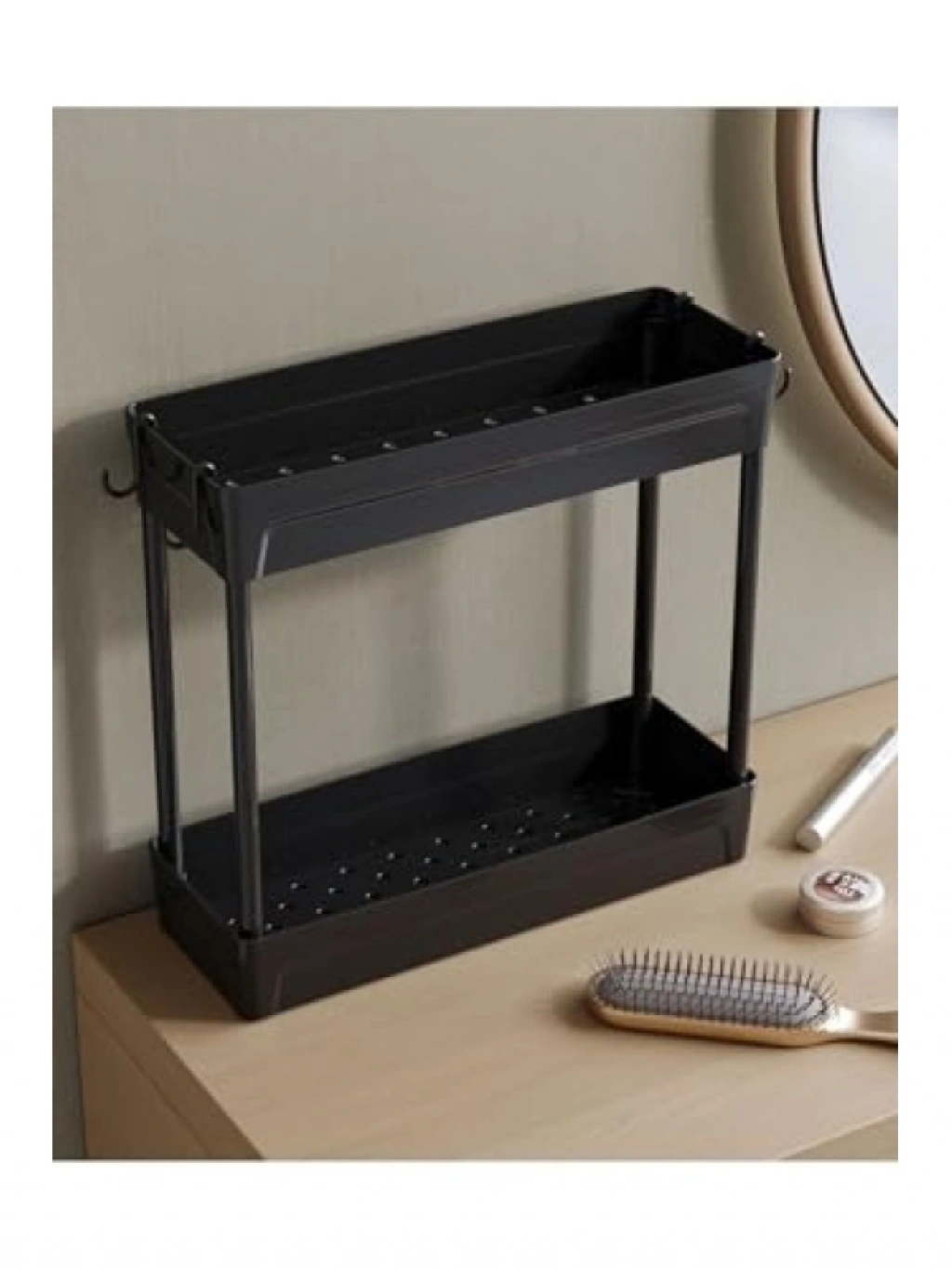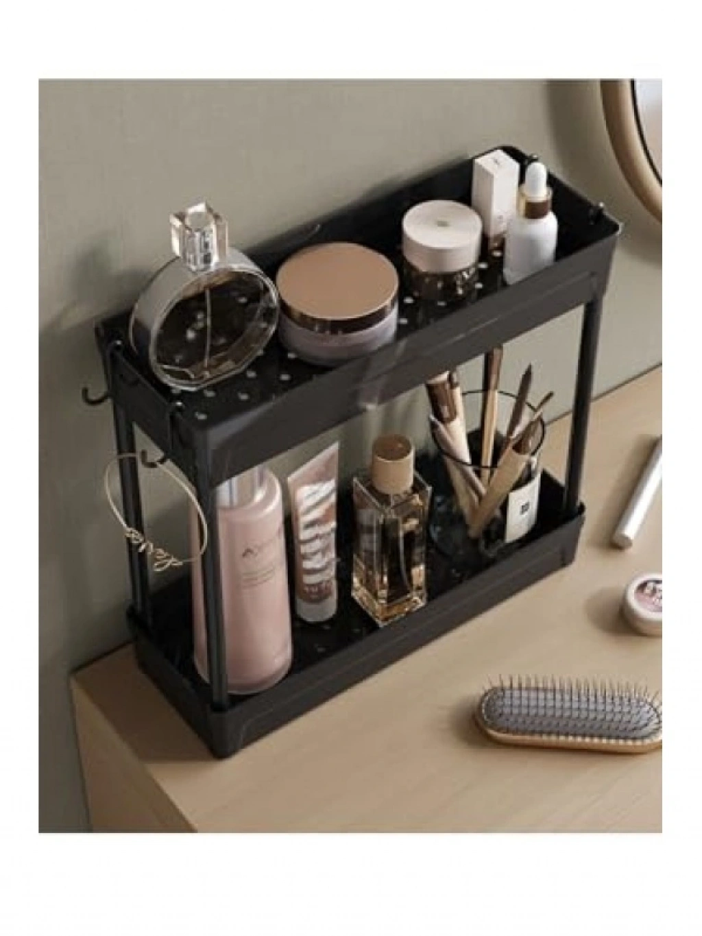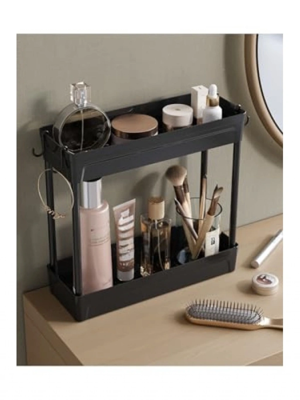 Siyah renkli iki katlı makyaj ve takı organizeri, tüm kozmetik ürünlerinizi düzenli bir şekilde saklamanızı sağlar. Kullanışlı yapısı ile alan tasarrufu sağlar ve şık bir görünüm sunar. Farklı bölmeleri sayesinde takı, ruj, fondöten gibi ürünlerinizi kolayca organize edebilirsiniz. Evde ya da seyahatlerde kullanıma uygun olan bu organizer, kozmetik tutkunları için mükemmel bir tercihtir.