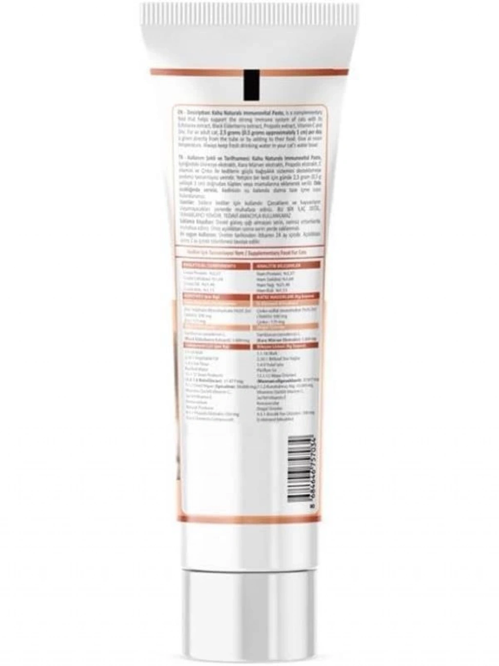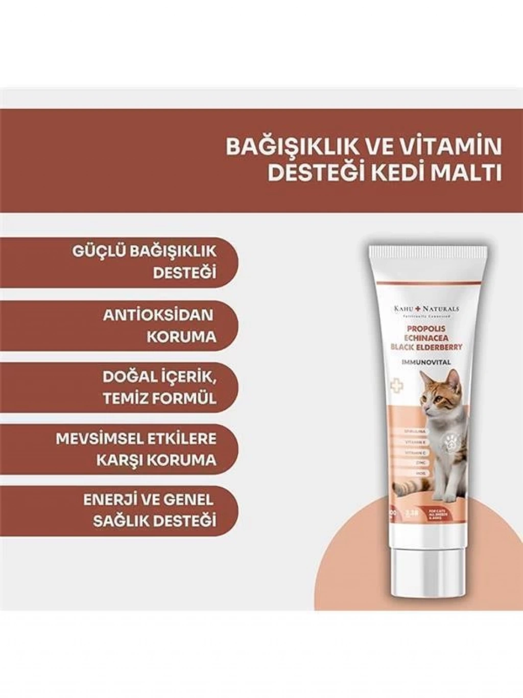 Bu ürün hakkında Naturals Immunovital Malt içeriğindeki Ekinezya ekstraktı Kara Mürver ekstraktı Propolis ekstraktı Spirulina Beta Glukan C vitamini ve Çinko ile kedilerin güçlü immün sistemini desteklemeye yardımcı tamamlayıcı yemdir Ekinezya Ekstraktı Özellikle immün sistemi destekleyici özellikleri ile bilinir ve vücudu zararlı etkenlere karşı koruyarak kedilerin savunma mekanizmalarını güçlendirmeye yardımcı olur Kara Mürver Ekstraktı Doğal antioksidanlarla doludur ve serbest radikallere karşı güçlü bir savunma sağlar İmmün sistemini güçlendirirken direnç kazanmalarına da katkıda bulunur Propolis Ekstraktı Arılar tarafından üretilen güçlü bileşen özellikleriyle kedilerin her daim sağlıklı kalmalarına yardımcı olur ve immüniteyi destekler C Vitamini ve Çinko Vücudun immün sisteminin işleyişini desteklemek ve oksidatif stresi azaltmak için birlikte çalışır C vitamini kolajen üretimini desteklerken çinko hücre onarımını hızlandırarak kedilerin sağlığını korur Spirulina Kedilerin enerji seviyelerini destekleyen besleyici maddelerle dolu bir süper besindir İmmün sistemini güçlendirirken vücutta yenileyici etki sağlar Güçlü bileşenleriyle kedilerin sağlığını desteklemek ve yaşam kalitesini artırmak için özenle geliştirilmiştir İmmün güçlendirici doğal içeriğiyle özellikle mevsim geçişlerinde hastalıklardan korunmada ameliyat öncesinde ve sonrasında aşının toksik etkisini hafifletmede vücut genel sağlığını desteklemede ve yoğun strese maruz kaldıklarında kedilerin sağlıklı kalmasını destekler Naturals Immunovital kedilerin hem fiziksel hem de zihinsel olarak daha aktif olmalarına yardımcı olur