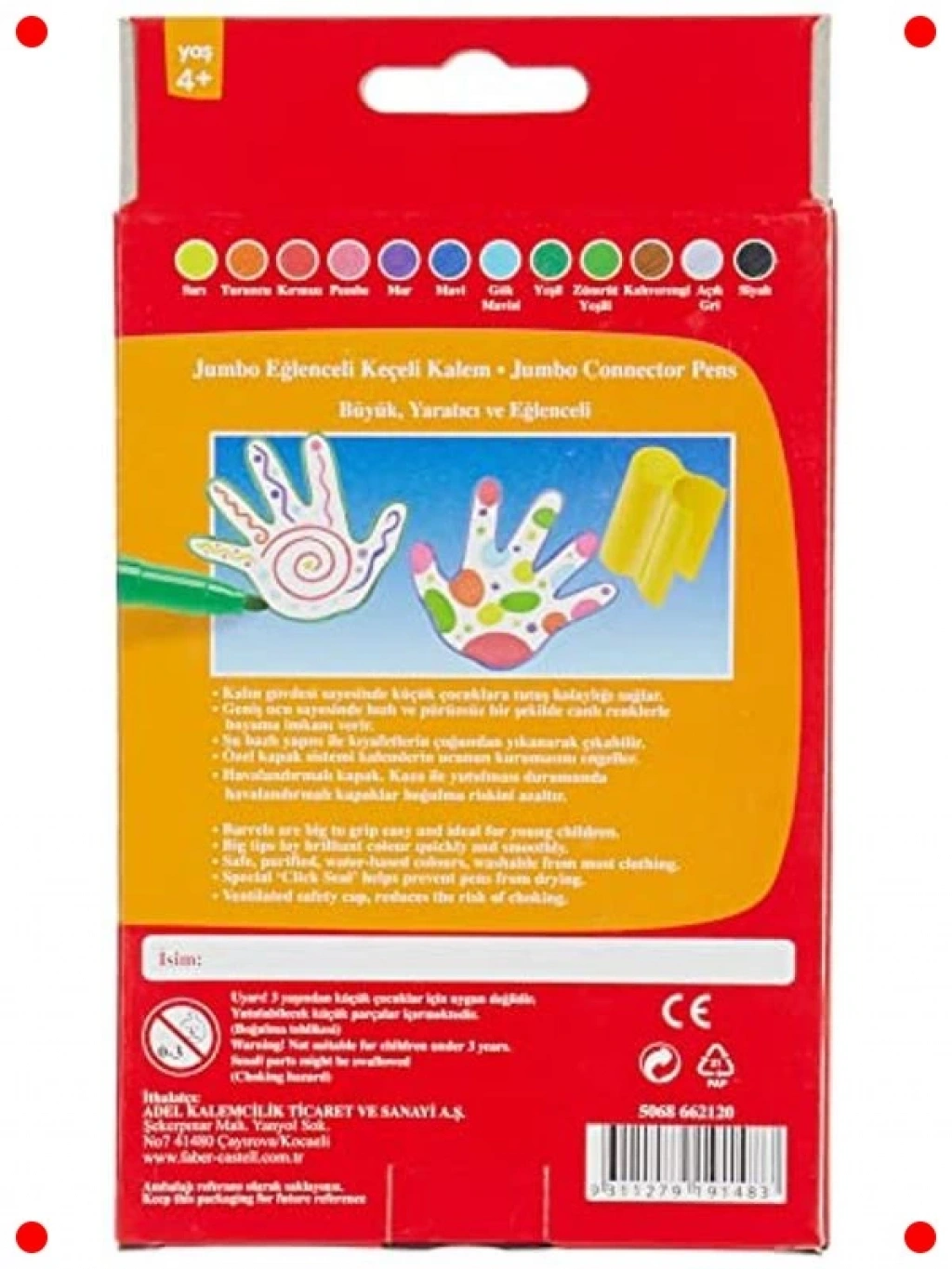 Sanatsal çalışmalarınıza renk katacak bu 12'li jumbo keçeli kalem setiyle yaratıcılığınızı serbest bırakın! Canlı ve parlak renklerden oluşan bu set, çocukların ve yetişkinlerin çizim, boyama ve projeleri için idealdir. Jumbo boyutu sayesinde minik ellerin rahatça kavraması için ergonomik bir tasarım sunar, bu da ince motor becerilerini geliştirmeye yardımcı olur. Toksik olmayan, su bazlı mürekkebi sayesinde güvenli bir kullanım sağlar ve giysilerden kolayca temizlenebilir. Okul ve evde kullanım için mükemmel olan bu kalemler, saatlerce süren sanatsal eğlence vaat ediyor.