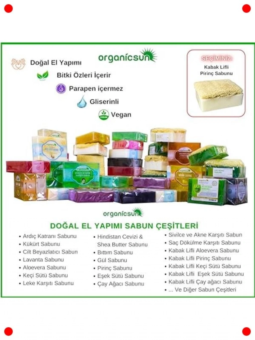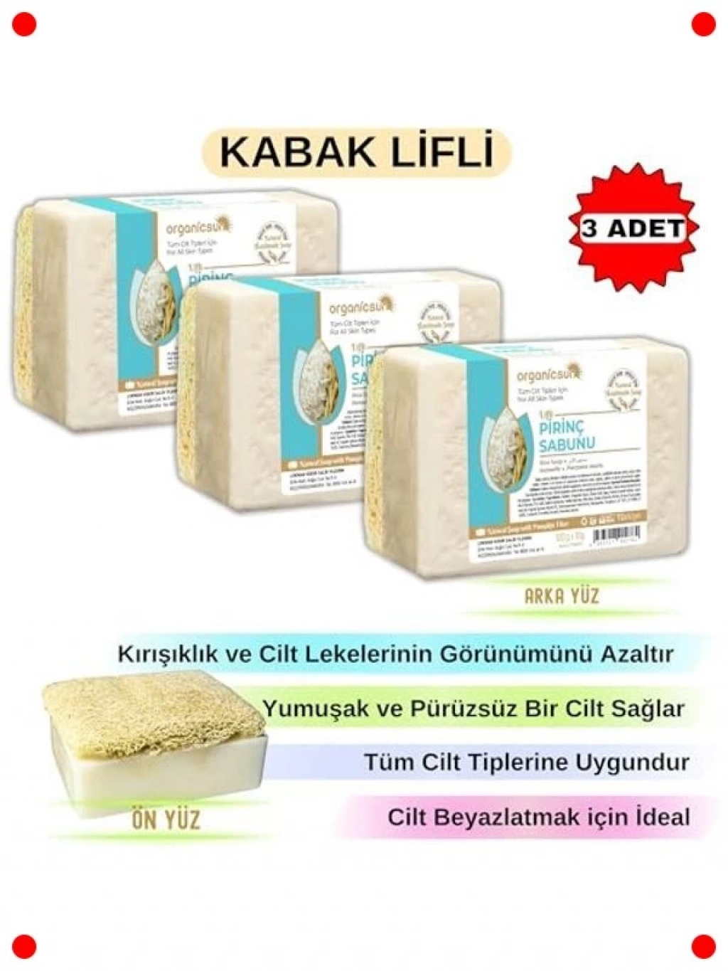 Cildinizi doğanın sunduğu güzellikle buluşturun! Bu özel kabak lifli pirinç sabunu, cildinizi nazikçe peeling yaparak ölü hücrelerden arındırır ve cildin daha aydınlık, canlı görünmesine yardımcı olur. Pirinç özleri sayesinde cilt tonu eşitsizliklerini gidermeye, leke görünümünü azaltmaya ve doğal bir parlaklık kazandırmaya destek olur. İçeriğindeki E ve B vitaminleri cildinizi derinlemesine beslerken, kabak lifi kan dolaşımını hızlandırarak cildin yenilenmesini ve sıkılaşmasını teşvik eder. Tüm cilt tipleri için uygun olan 3 adetlik bu avantajlı set, düzenli kullanımda daha pürüzsüz, canlı, eşit tonlu ve sağlıklı bir cilt vaat eder. Doğal içeriği ile cildinize hassas bir bakım sunar.