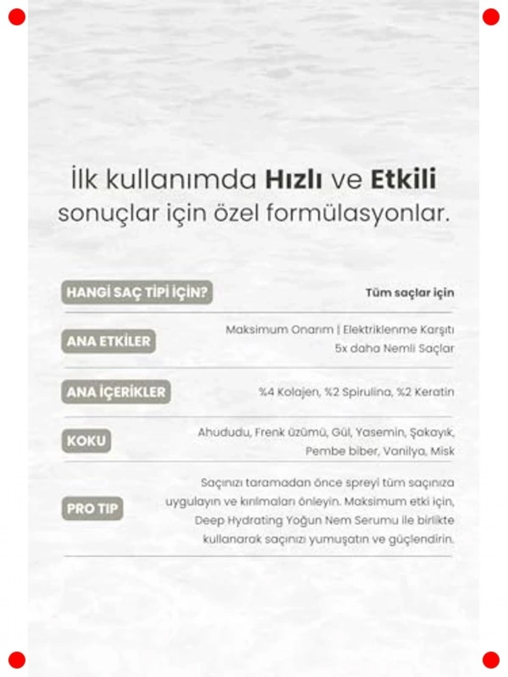 Saçlarınızdaki kabarıklığı ve elektriklenmeyi kontrol altına almak için özel olarak formüle edilmiş bu onarıcı bakım spreyi, pürüzsüz ve parlak saçlara kavuşmanızı sağlar. Saç tellerini nemlendirirken, nemli hava koşullarının neden olduğu kabarıklığı engellemeye yardımcı olur. Onarıcı özellikleri sayesinde saçlarınızın daha sağlıklı görünmesini destekler. Seyahat boyu 100 ml'lik pratik şişesi sayesinde çantanızda kolayca taşıyabilir, nerede olursanız olun saçlarınıza anında bakım yapabilirsiniz. Saçlarınıza kolay şekil verme ve gün boyu kalıcı etki sunar.