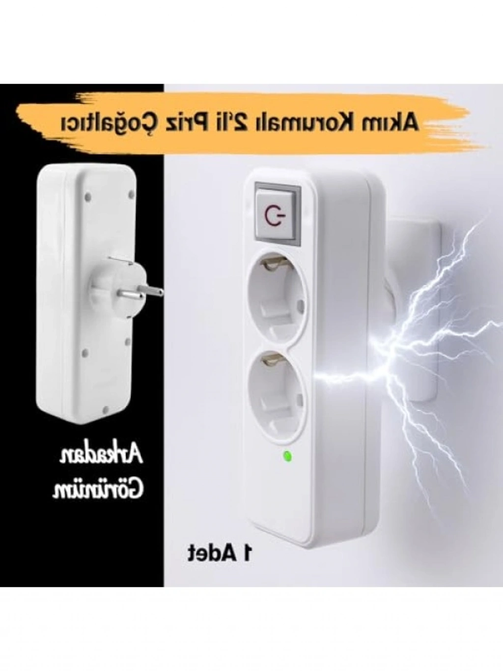 Kablosuz akım korumalı grup priz, 2 adet topraklı elektrik prizi ile güvenli kullanım sağlar. Düğmeli fiş özellikleri ile pratik bir kullanım sunar. Ev ve ofis ortamlarında elektrikli cihazların güvenli şekilde çalışmasını destekler.