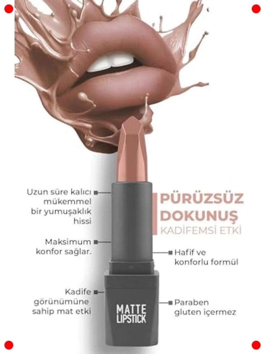 Dudaklarınıza anında yoğun renk ve sofistike bir dokunuş katmak isteyenler için ideal olan bu kadifemsi mat ruj, uzun süre kalıcı formülüyle tüm gün tazeliğini korur. Özel nemlendirici içerikleri sayesinde dudakları kurutmadan pürüzsüz ve rahat bir uygulama sağlar. Nude tonu, doğal güzelliğinizi ön plana çıkarırken, her makyaj stiline kolayca uyum sağlar. Günlük kullanımda veya özel davetlerde kendinizi şık ve modern hissetmenizi sağlar. Dudaklarınızda ağırlık yapmayan hafif dokusuyla konforlu bir kullanım sunar. Çarpıcı ve elegan bir görünüm için vazgeçilmez bir parçadır.