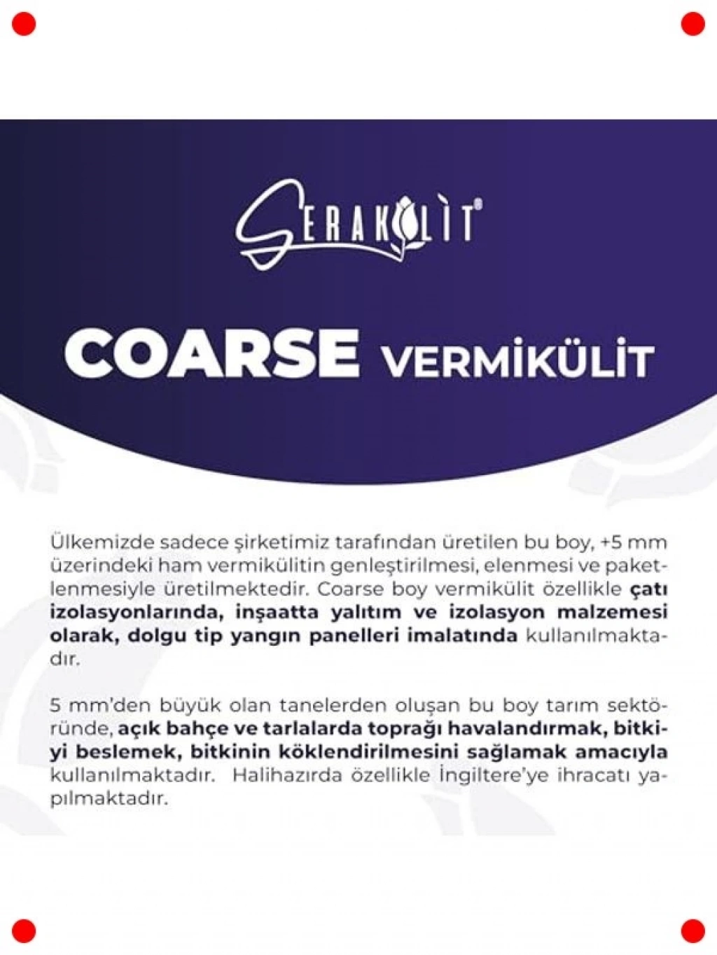Saksı bitkileriniz ve bahçe projeleriniz için mükemmel bir çözüm sunan bu 5 litrelik kalın taneli bahçe vermiküliti ile toprağınızın drenajını ve havalandırmasını iyileştirin. Büyük partikül yapısı sayesinde, yoğun topraklarda bile köklerin rahatça nefes almasını sağlar ve su birikimini önler. Bu özellik, özellikle kök çürümesini önlemek ve sağlıklı kök gelişimi için kritik öneme sahiptir. Aynı zamanda su tutma kapasitesini de koruyarak bitkilerinizin kuraklığa karşı direncini artırır. Saksı harcı karışımlarında, orkide ve diğer özel bitkilerin yetiştirilmesinde idealdir. Hafif ve steril yapısıyla bitki hastalıklarının yayılmasını engeller ve bitkilerinizin genel sağlığını destekler. Bahçenizdeki bitkiler için uzun vadeli ve etkili bir destek sunar.