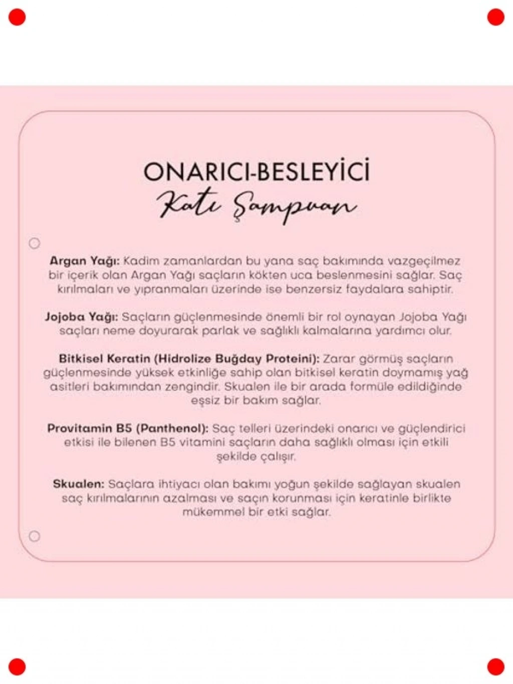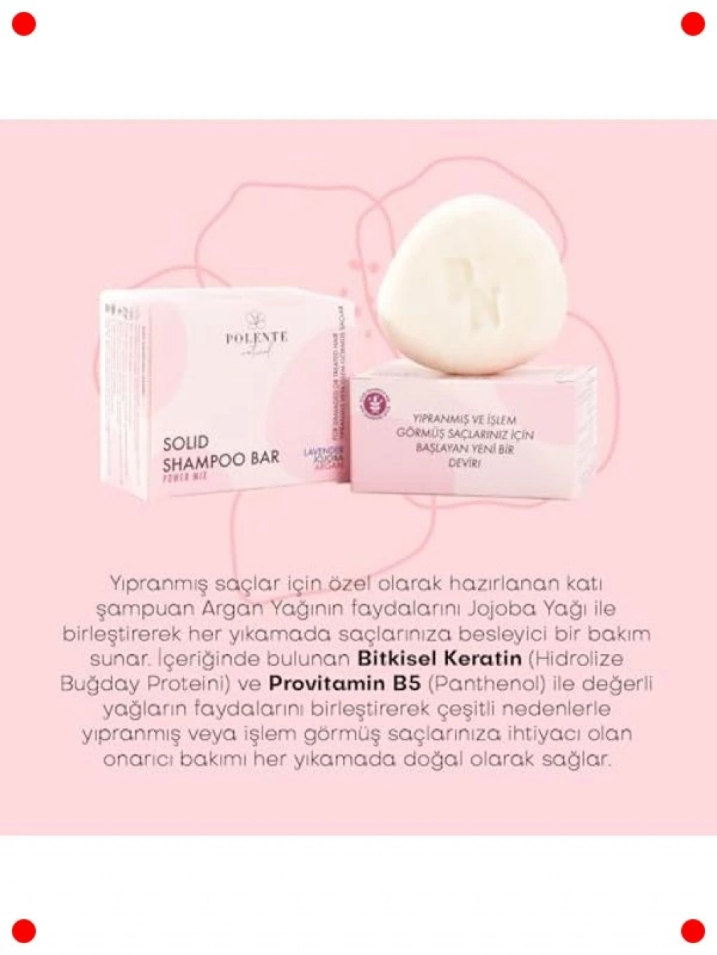 Çevre dostu ve pratik bir yaklaşımla yıpranmış, işlem görmüş saçlarınıza yoğun bakım sunun. Bu katı şampuan, zengin onarıcı ve besleyici içeriğiyle saç tellerini kökten uca güçlendirir, eski sağlığına kavuşturur. Kimyasal işlemler, ısı veya çevresel faktörler nedeniyle zarar görmüş saçları hedef alarak derinlemesine nemlendirme sağlar. SLS/SLES, paraben gibi zararlı kimyasallar içermeyen doğal formülü, saç derinizi nazikçe temizler. Kompakt yapısı sayesinde seyahatlerde kolayca taşınabilir ve tek bir bar, klasik şampuan şişelerine göre daha uzun süre dayanır. Sürdürülebilir güzellik rutininizin vazgeçilmezi.