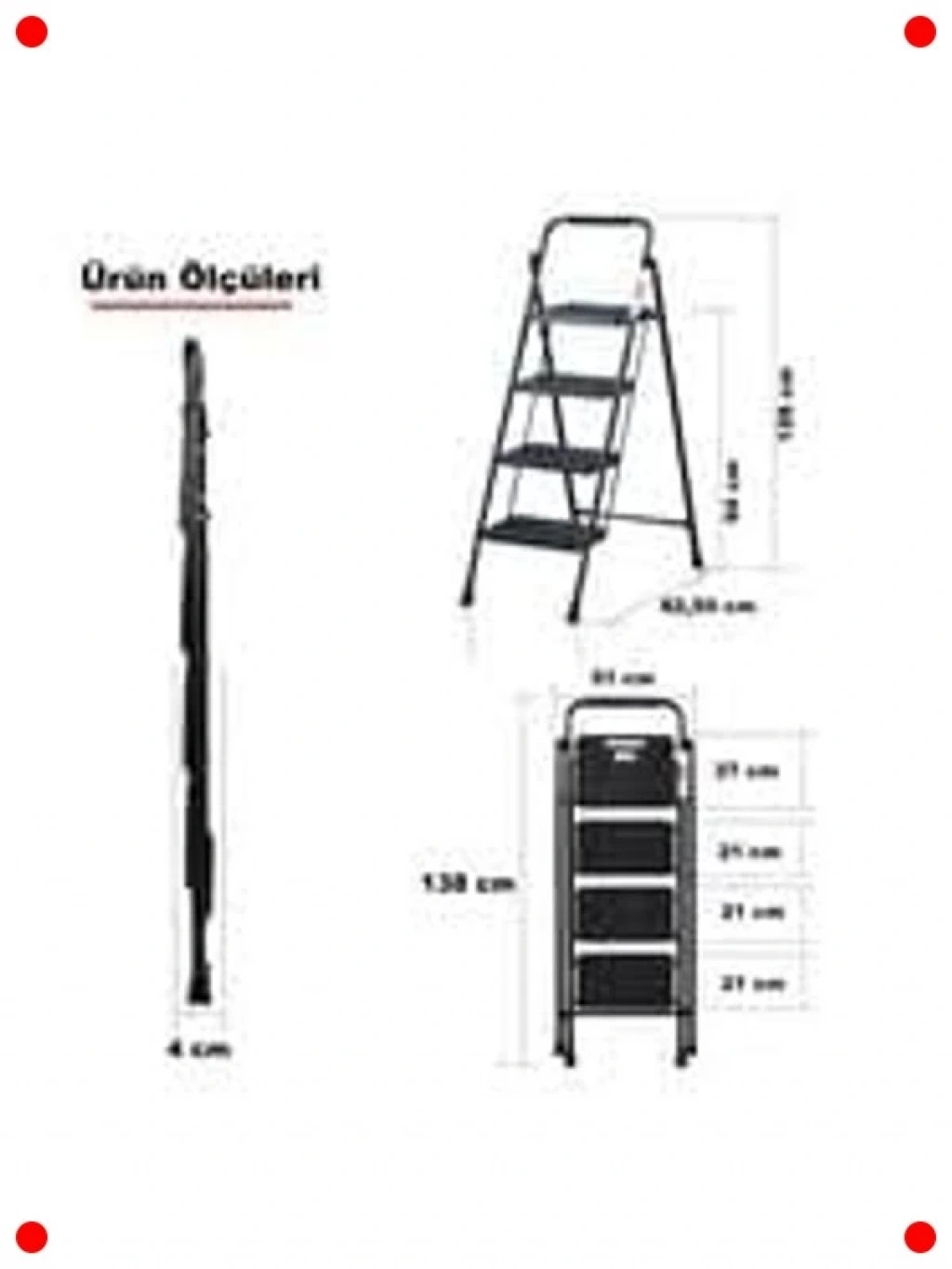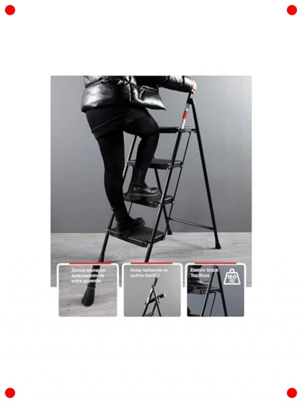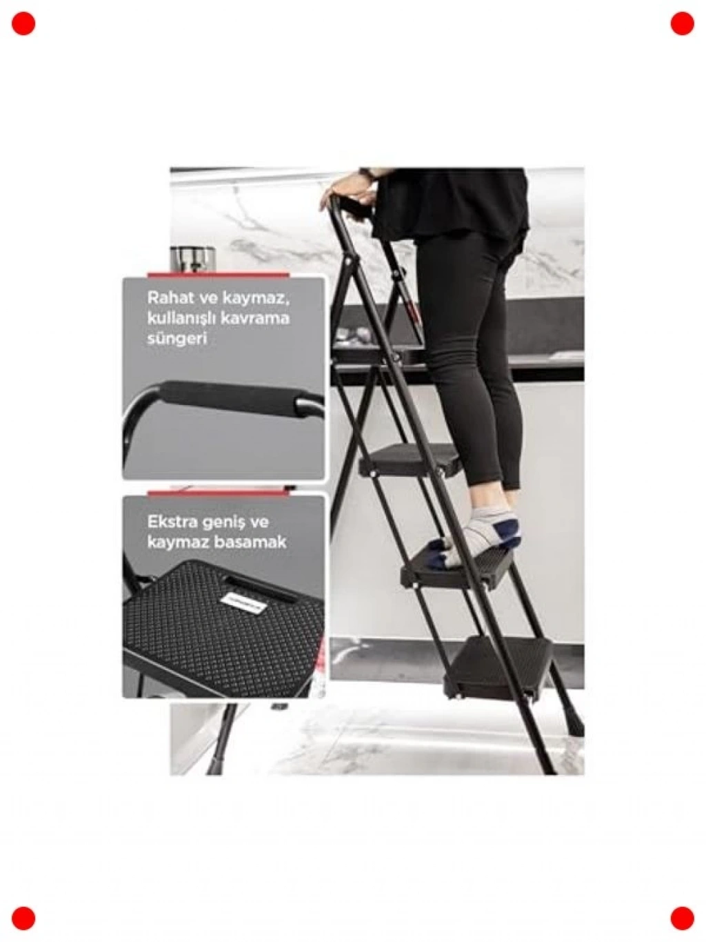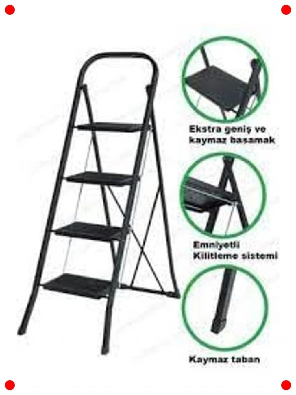 Ev işlerinizi güvenle halletmeniz için tasarlanmış bu 4 basamaklı katlanabilir merdiven, dayanıklı ve sağlam yapısıyla öne çıkar. Geniş basamakları ve kaymaz yüzeyi sayesinde maksimum denge ve güvenlik sunar. Yüksek raflara ulaşmaktan ampul değiştirmeye, duvarları boyamaktan temizlik yapmaya kadar birçok ev işinde vazgeçilmez yardımcınızdır. Katlanabilir özelliği sayesinde kullanım sonrası kolayca saklanabilir, evinizde yer kaplamaz. Hafif yapısı sayesinde rahatlıkla taşınabilir, hem iç hem de dış mekanlarda pratik kullanım imkanı sunar. Sağlam çelik veya alüminyum gövdesi uzun ömürlü kullanım vaat eder.