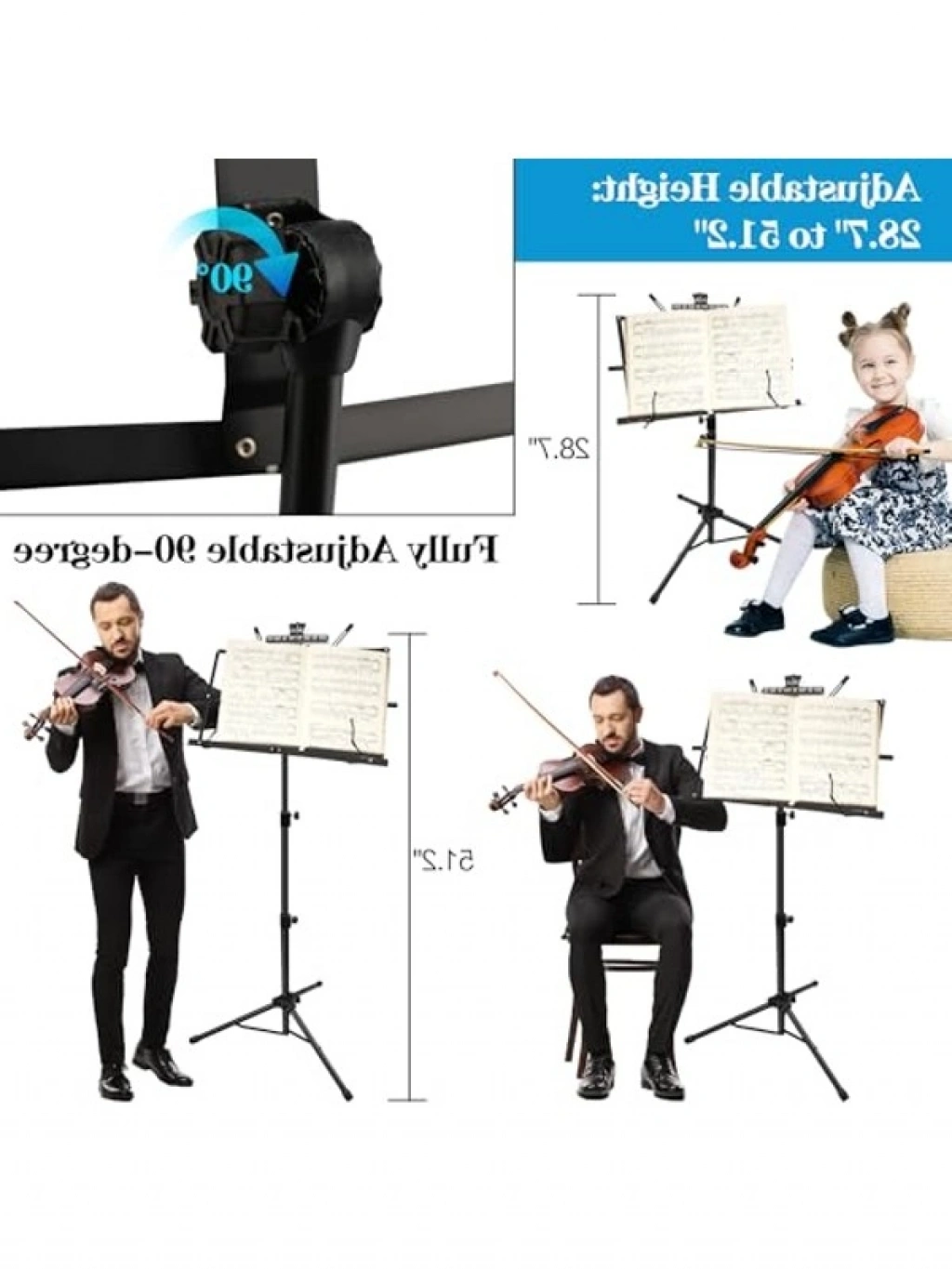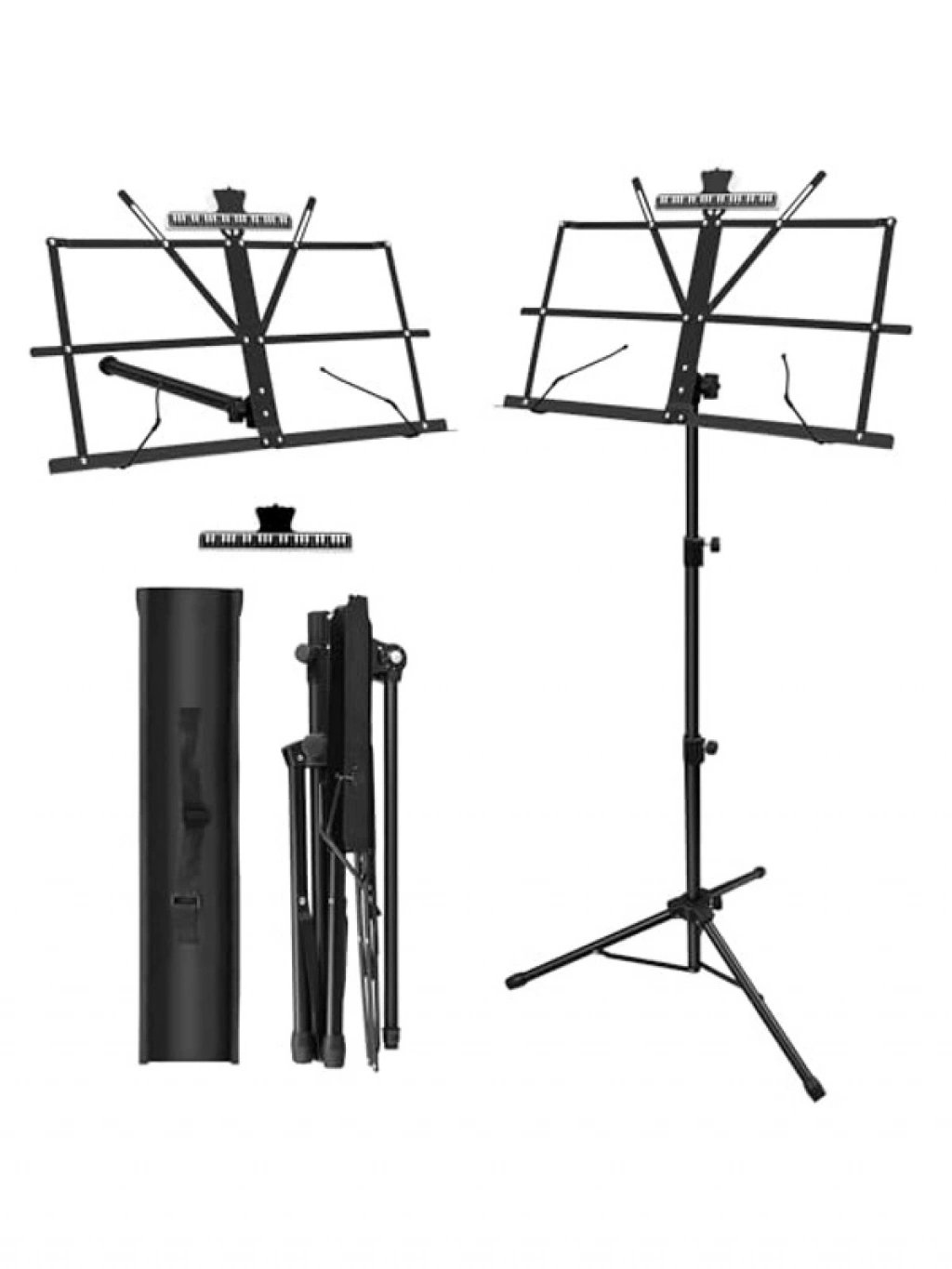 Katlanabilir nota standı, taşıma çantası ve klips ile birlikte gelir. Ayarlanabilir yüksekliği 28,7 inç ile 51,5 inç arasında değişebilir. 90 dereceye kadar eğilebilir kitap tepsisi, oturarak ya da ayakta durarak kullanıma uygundur. Sağlam metal tripod tabanı sayesinde güvenle kullanılabilir.