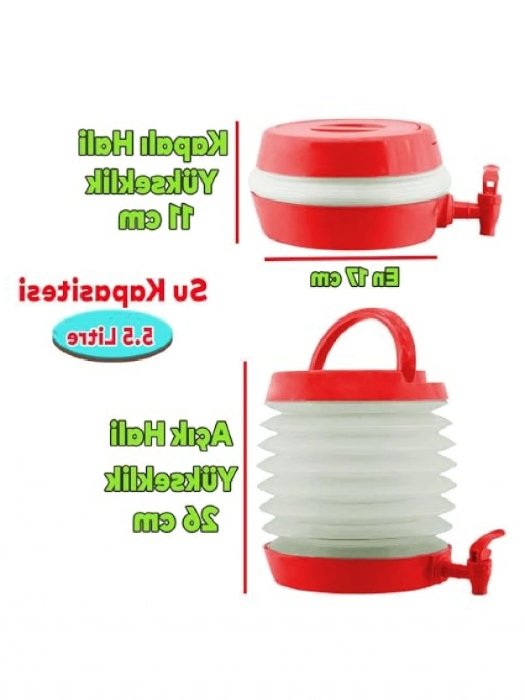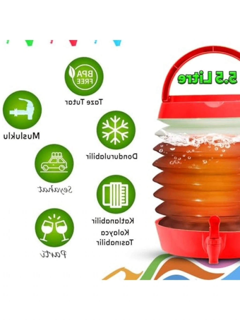 5.5 litre kapasiteye sahip bu akordiyonlu su sebili, piknik ve kamp aktiviteleri için idealdir. Katlanabilir yapısı sayesinde taşınması son derece kolaydır. Musluklu tasarımı ile pratik kullanım sunar. Sağlıklı içeceklerinizi her zaman yanınızda taşıyabilirsiniz.