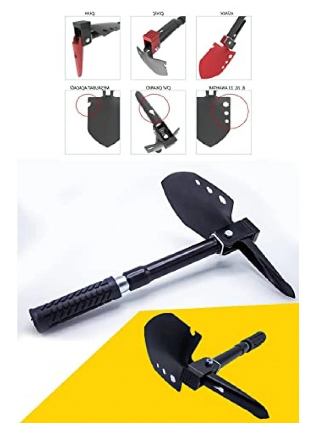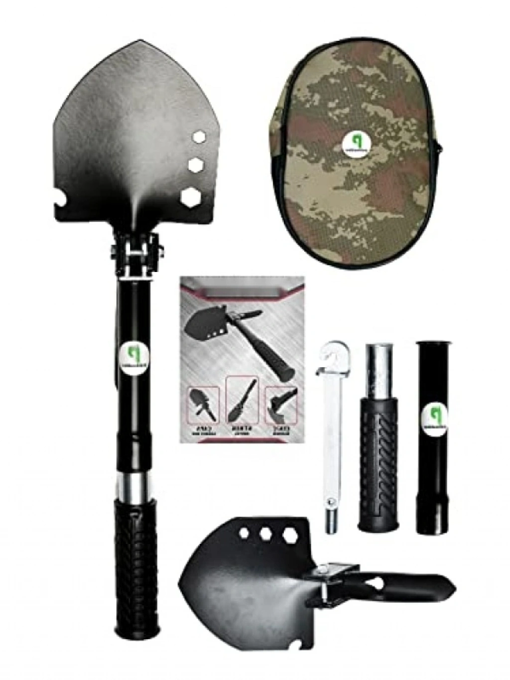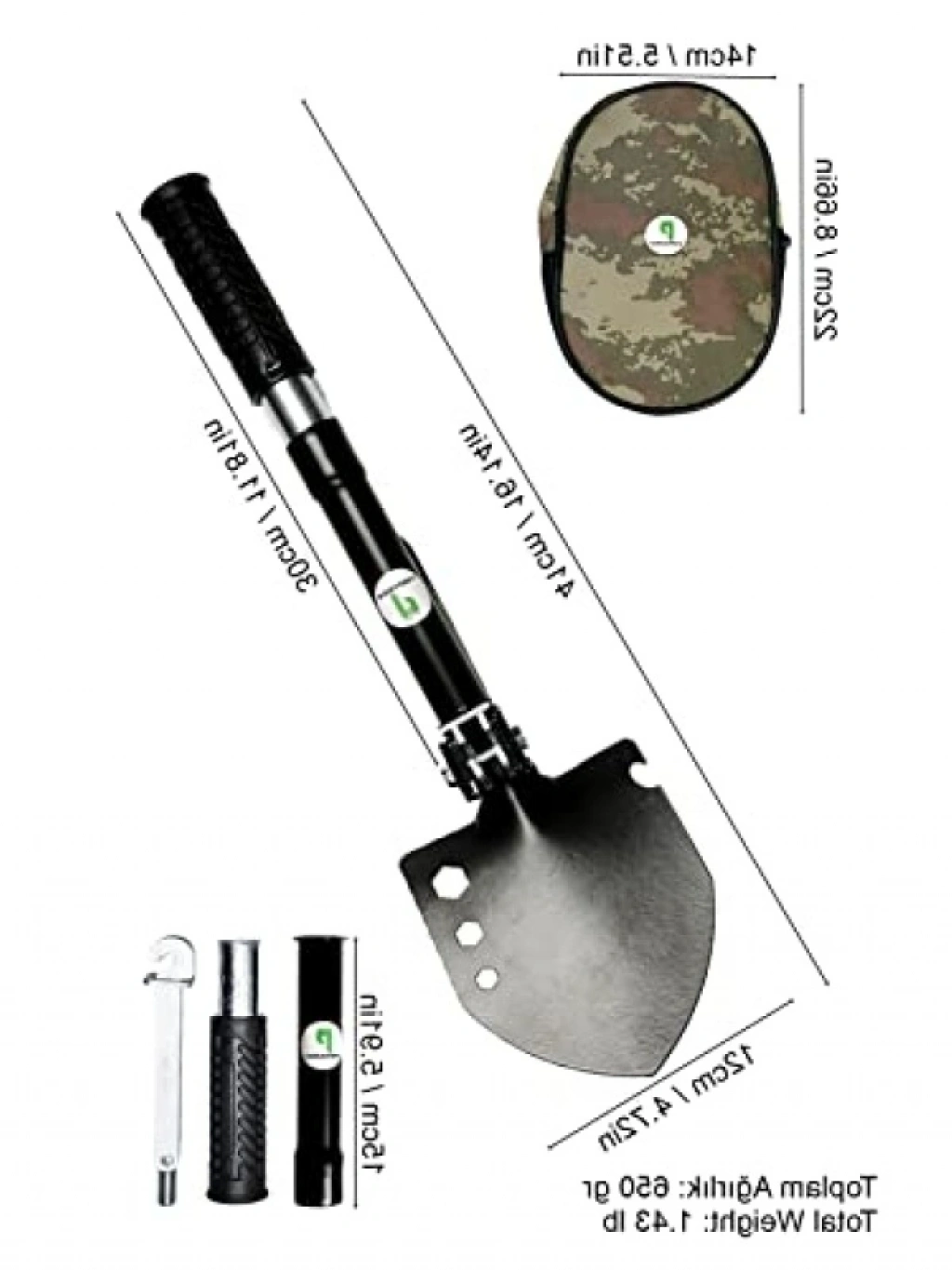 Bu katlanabilir kamp küreği, çekiç, çapa ve birçok işlevi bir arada sunan multitool setidir. 41 cm uzunluğundaki kürek başlığı, çeşitli işlevler için somun anahtarı delikleri ve açacak sekmesi ile donatılmıştır. Dayanıklı çelik ve hardo malzemeden üretilmiştir, hafif yapısı ile taşıması kolaydır. Set, pratik bir çantada gelir ve kamp aktiviteleri için vazgeçilmez bir yardımcıdır.