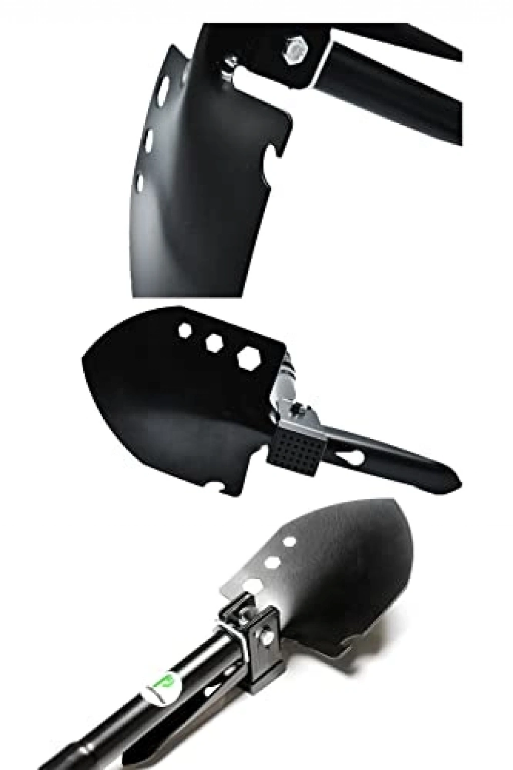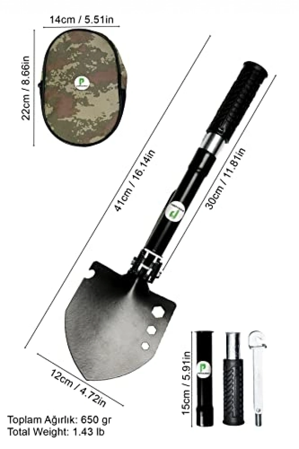 Katlanır kamp küreği seti, 41 cm uzunluğunda ve 600 gram ağırlığında. Kürek başlığı üzerindeki somun anahtarı delikleri ve açacak sekmesi ile pratik kullanım sunar, ayrıca çantası ile taşıma kolaylığı sağlar.