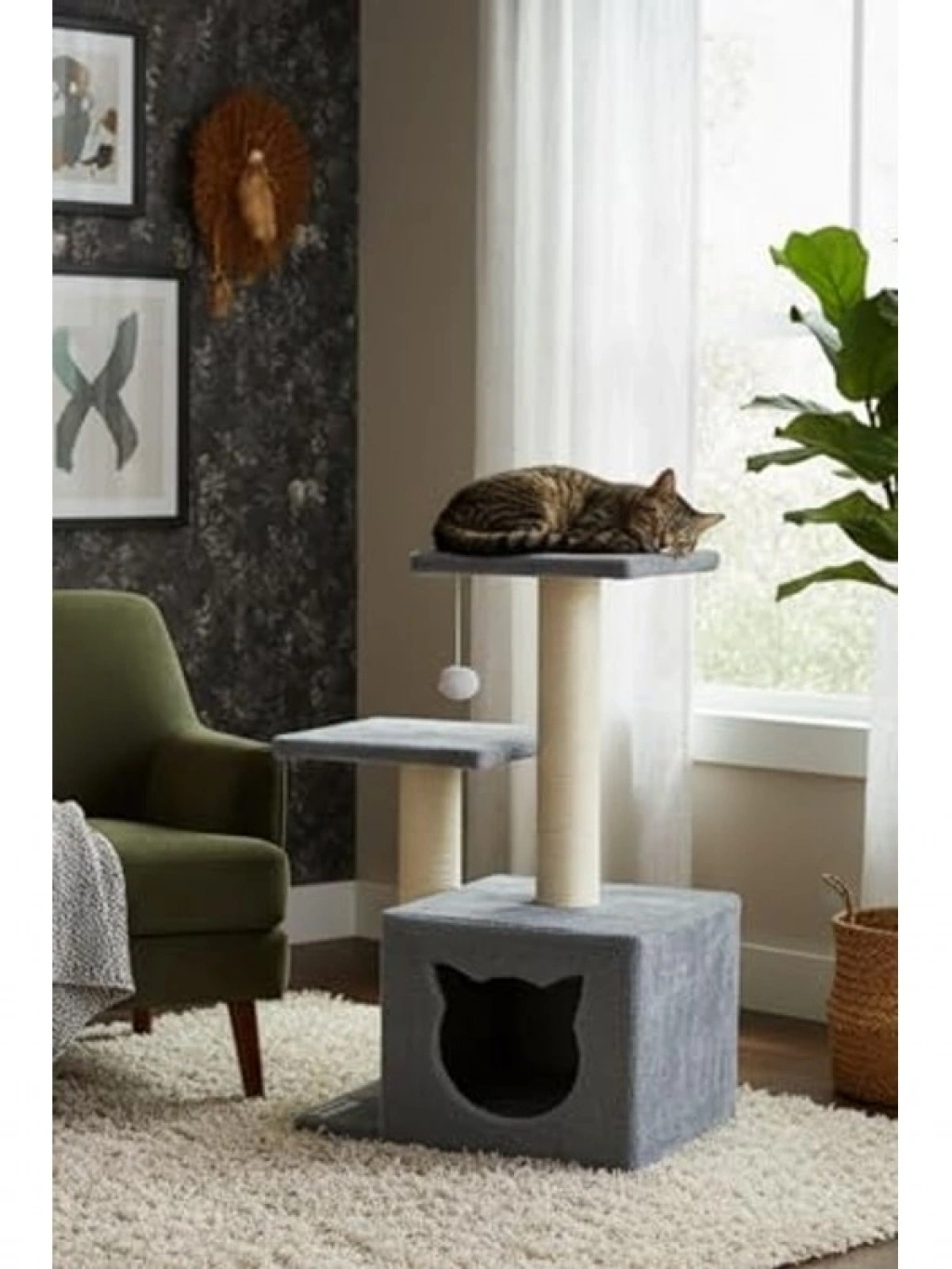 Kedi görünümüne sahip antrasit renkli tırmalama, sağlam yapısıyla dikkat çeker. 20-30 kg ağırlık taşıma kapasitesine sahip olan bu ürün, antibakteriyel welsoft kumaş kaplaması ve yumuşak dokusuyla kedilerin rahat bir alan oluşturmasına olanak tanır. Zemin ölçüleri 45 cm x 35 cm olup, toplam yüksekliği 72 cm'dir.