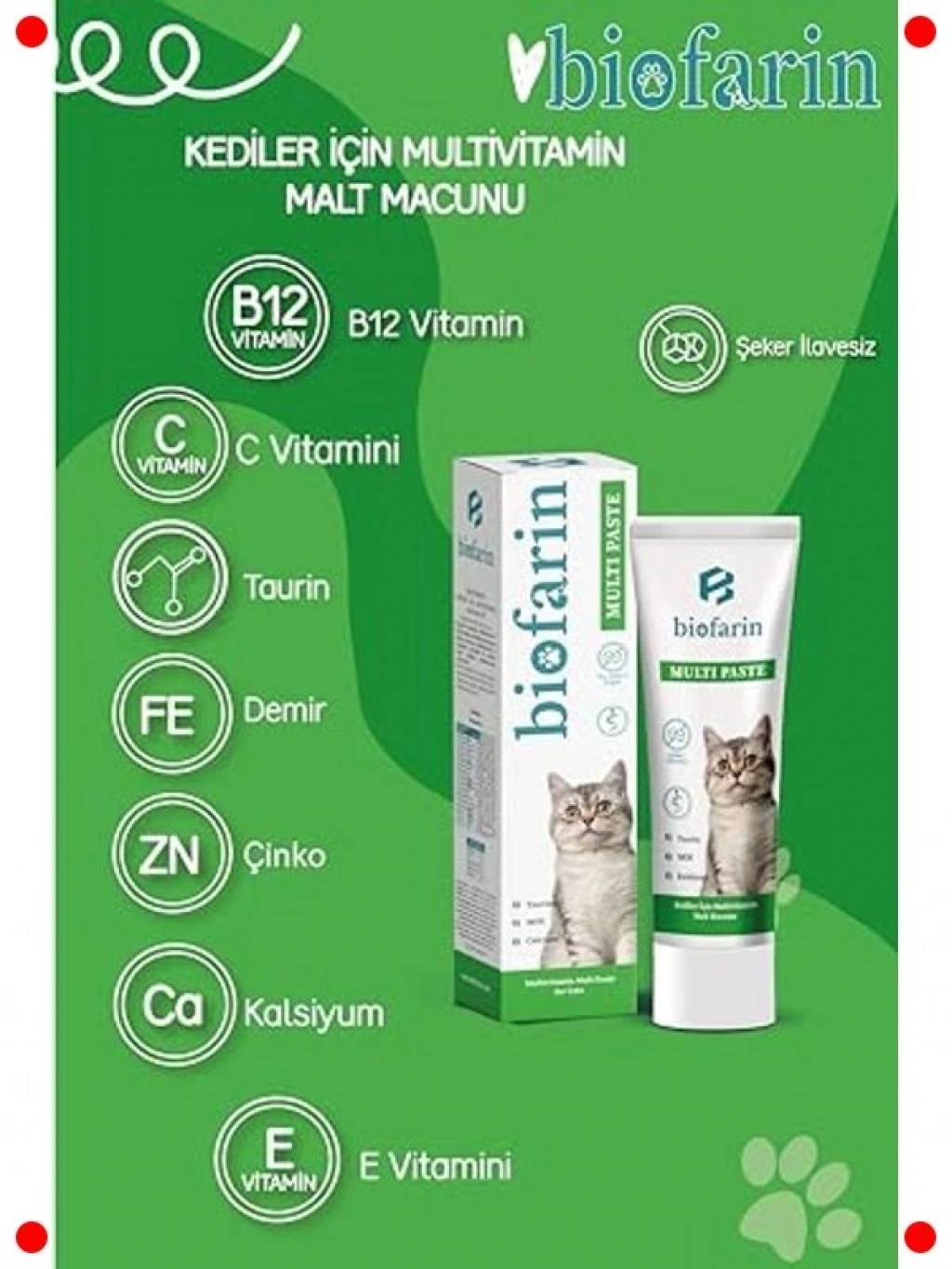 Kedinizin canlılığını ve sağlığını desteklemek için özel olarak geliştirilmiş bu multivitamin macunu, zengin içeriğiyle dikkat çeker. Tüy yumağı oluşumunu engellemeye yardımcı olarak sindirim sisteminin düzenli çalışmasına katkıda bulunur. Aynı zamanda içerdiği temel vitamin ve mineraller sayesinde kedinizin bağışıklık sistemini güçlendirir, hastalıklara karşı direncini artırır. Düzenli kullanımda kedinizin tüylerinin daha parlak ve sağlıklı görünmesini sağlar, enerji seviyesini yükseltir. 100 gramlık pratik tüpü ile kolayca verilebilir, kedinizin günlük besin takviyesi ihtiyacını karşılar.