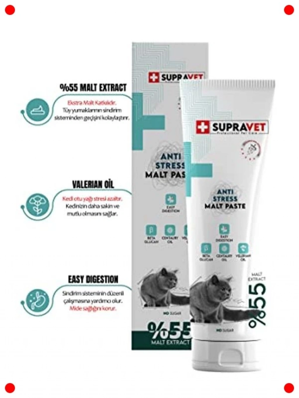 Kedinizin stresli anlarında sakinleşmesine yardımcı olmak üzere özel olarak geliştirilmiş bu şekersiz macun, rahatlatıcı bir etki sunar. Veteriner ziyaretleri, seyahat, yeni bir ortama adaptasyon veya ani değişiklikler gibi durumlar kedilerde strese neden olabilir. Bu macun, içerdiği özel bileşenlerle kedinizin rahatlamasına ve gerginliğini azaltmasına destek olur. %55 extra malt içeriği sayesinde aynı zamanda sindirim sistemini de destekler ve tüy yumağı oluşumunu önlemeye katkıda bulunur. Kolayca verilebilen lezzetli formu sayesinde kediniz severek tüketir. Kedinizin huzurlu ve sakin kalmasına yardımcı olun.