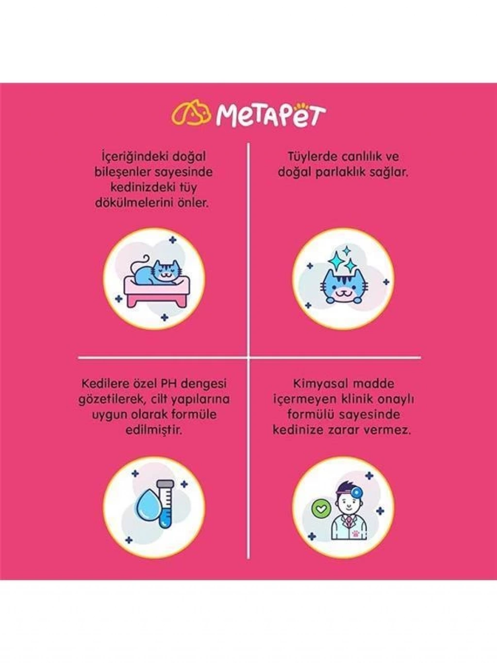 Bu ürün hakkında İçeriğindeki E vitamini argan yağı ve özel doğal bileşenler sayesinde kedilerinizdeki tüy dökülmesini engeller Tüylere doğal parlaklık ve canlılık kazandırır Kolay tarama saglar Cildi besler ve derinlemesine temizler KULLANIM TALİMATI Kedilerinizin tuylerinin uzerine gozlere temas ettirmeden eliniz ile bastan kuyruga dogru masaj yaparak surunuz Kagıt havlu veya bir bez ile silin Dilediginiz sıklıkta kullanabilirsiniz Ürün Boyutu 200 ML Son Kullanma Tarihi 01022026